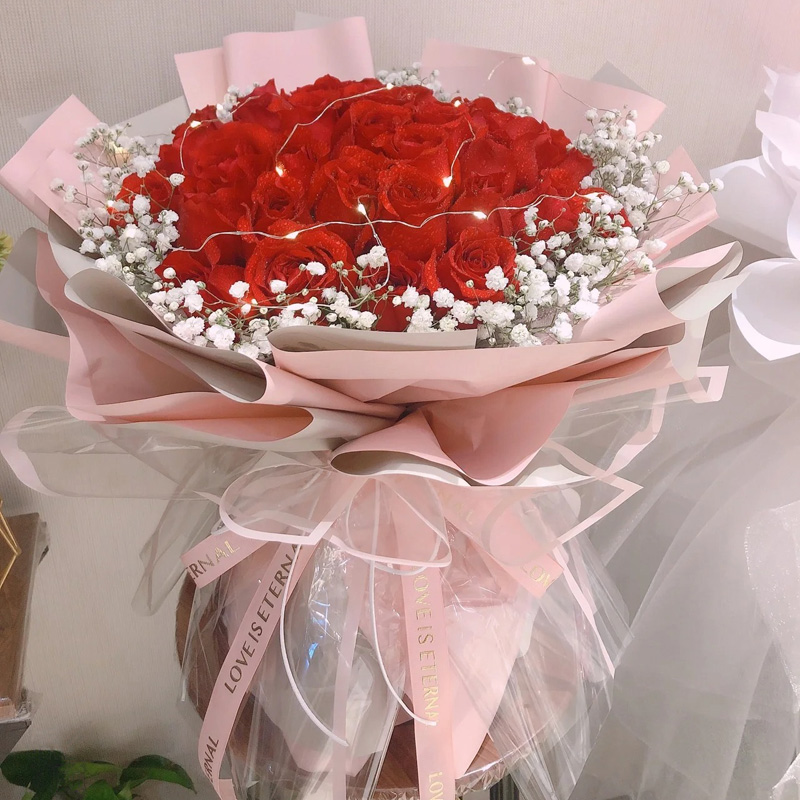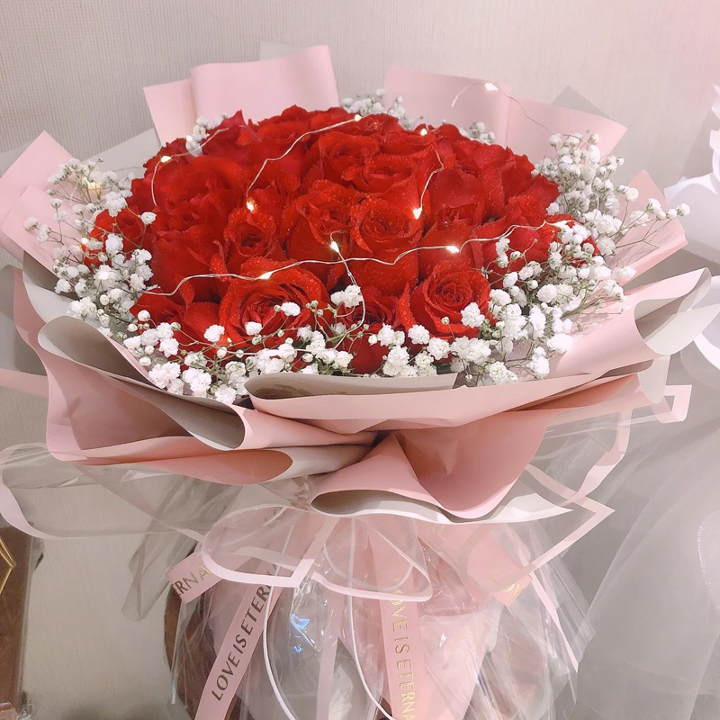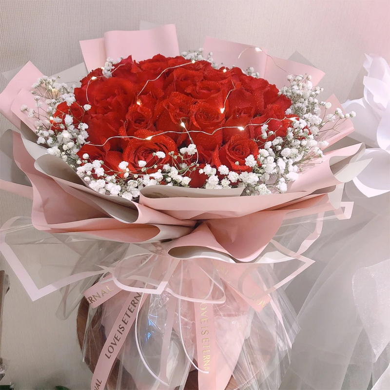 花 材:精选33朵红玫瑰,1条灯串,满天星环绕。