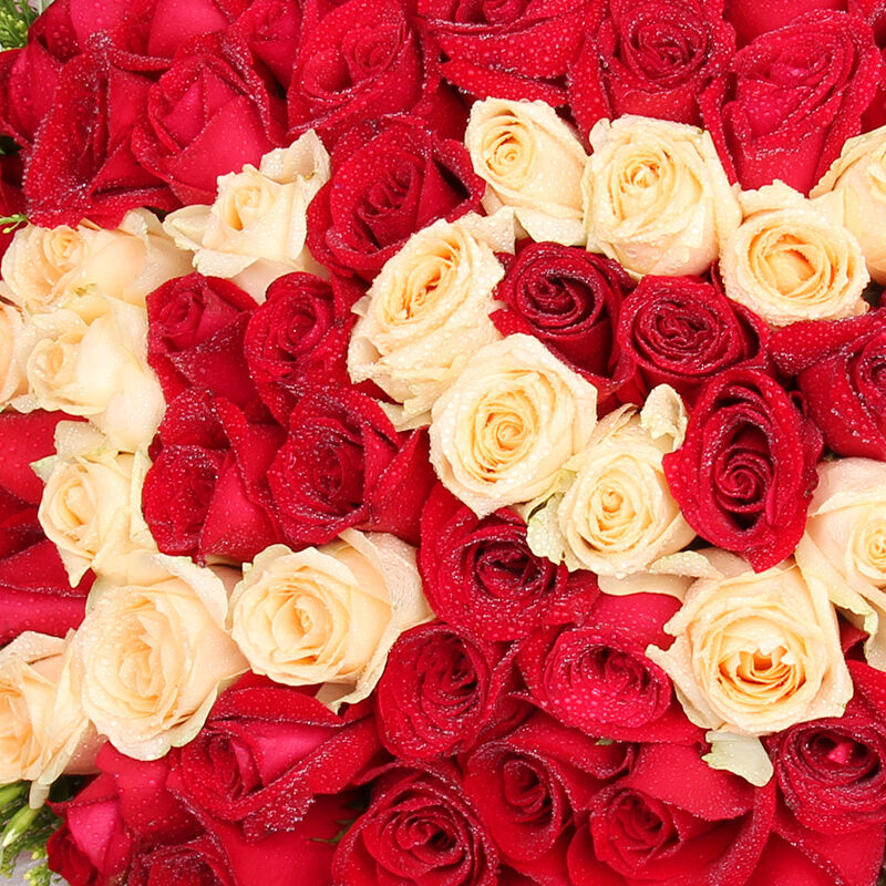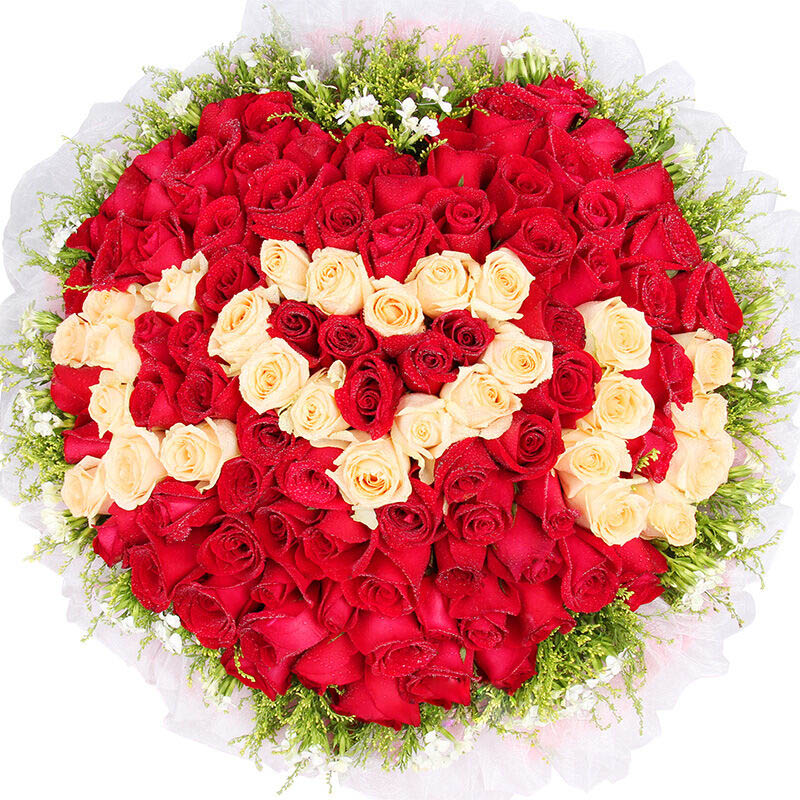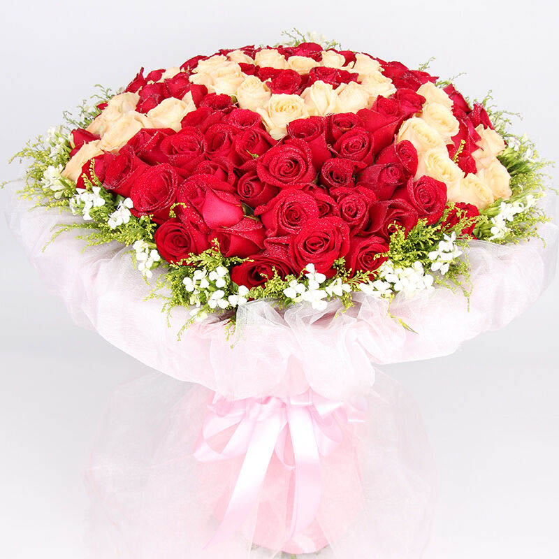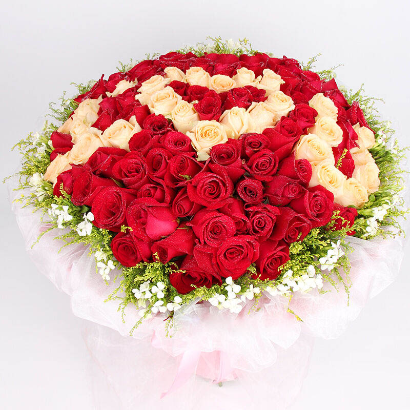 花 材:精选顶级香槟玫瑰做成IOU,外围红玫瑰,共99朵,黄莺,相思梅搭配。
