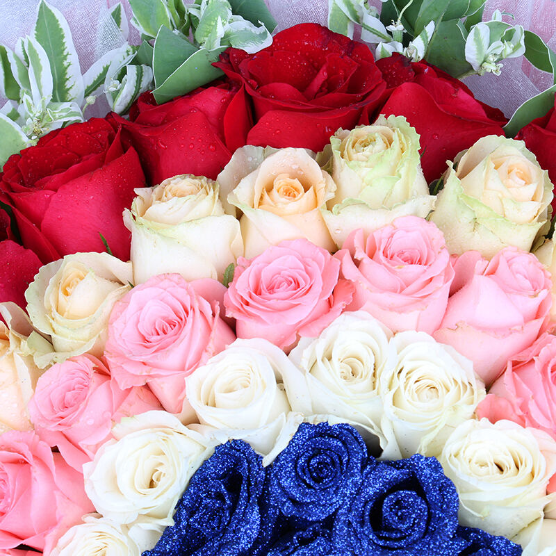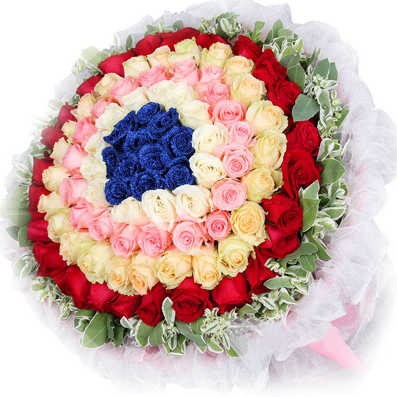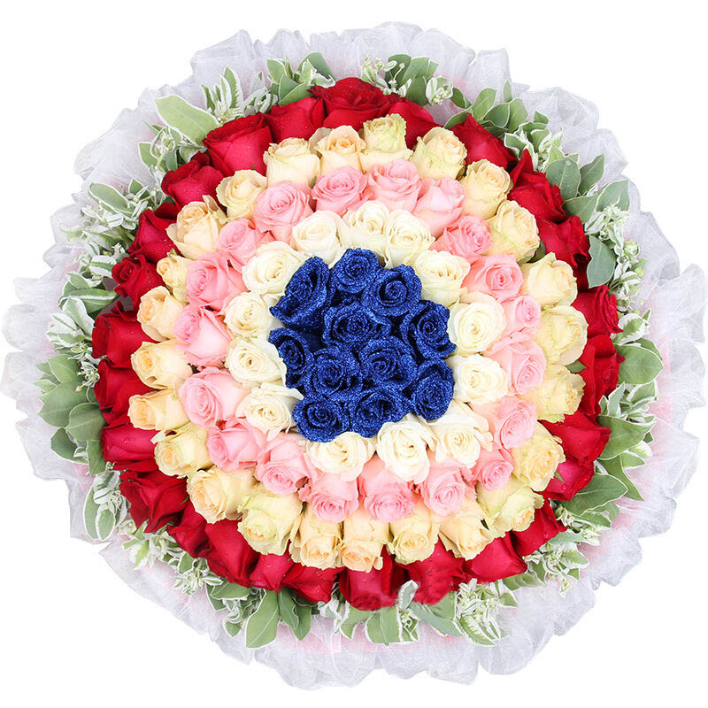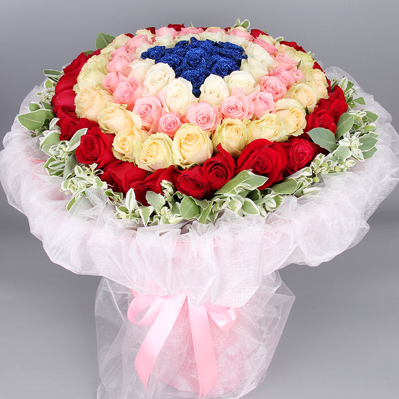 花材: 精选99朵玫瑰(顶级蓝玫瑰,白玫瑰,粉玫瑰,香槟玫瑰,红玫瑰),相思梅围绕。