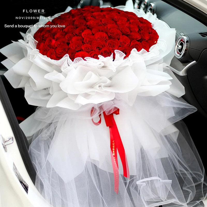 包 装:欧根纱内衬,雾面纸多层叠角包装,仙女纱长拖尾,红色花结。