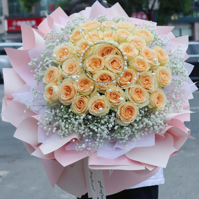 花材: 33朵香槟玫瑰,1个皇冠,搭配满天星环绕。