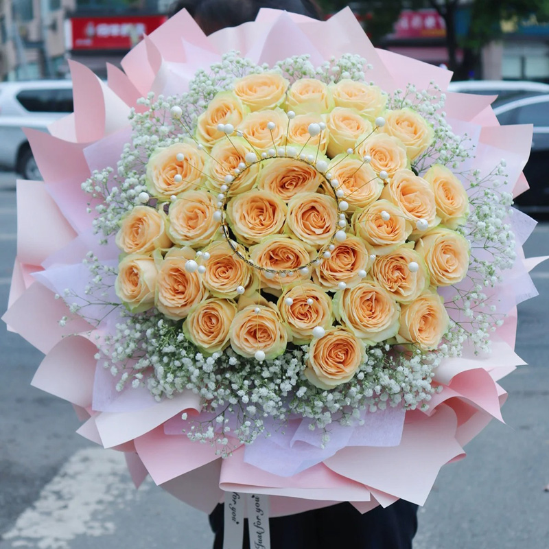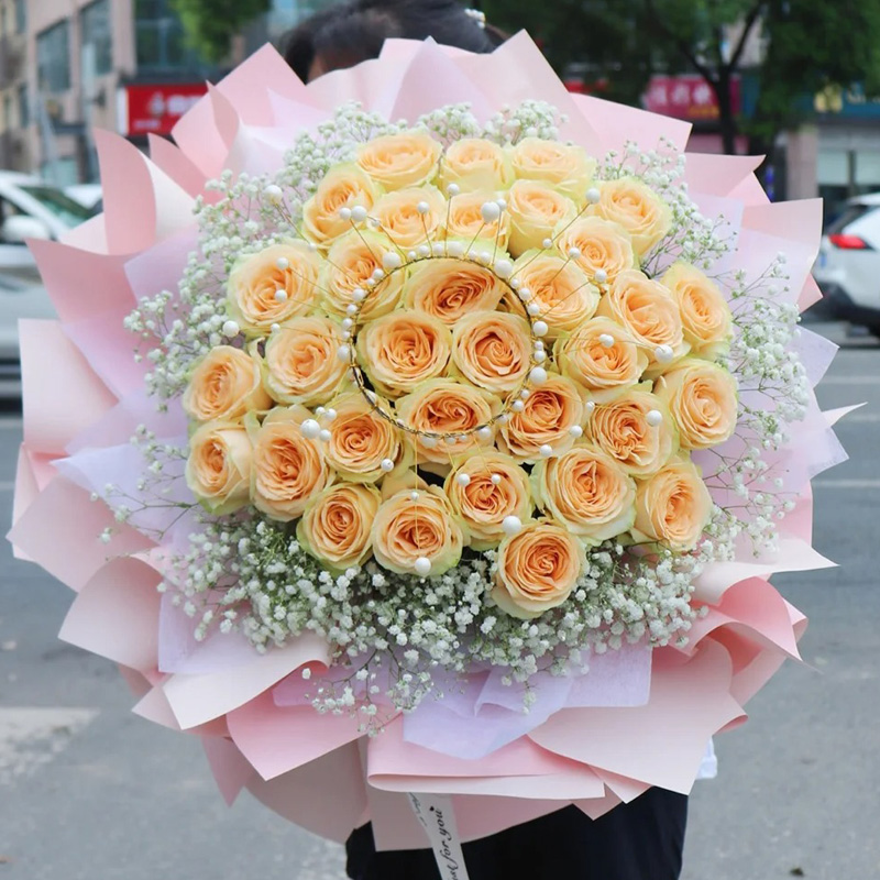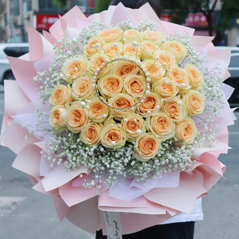 花 材:33朵香槟玫瑰,1个皇冠,搭配满天星环绕。
