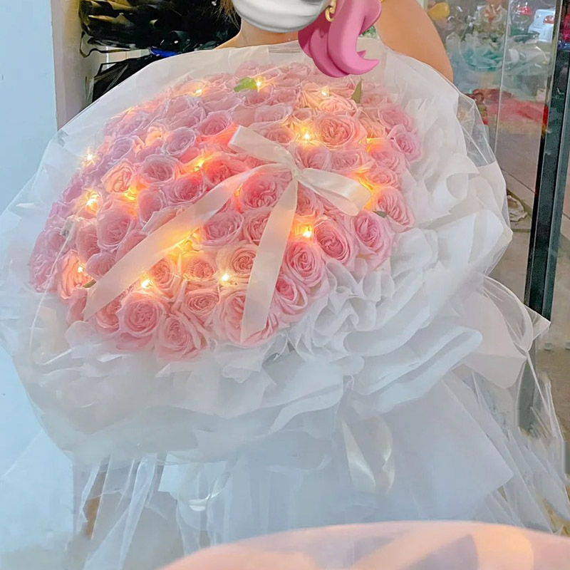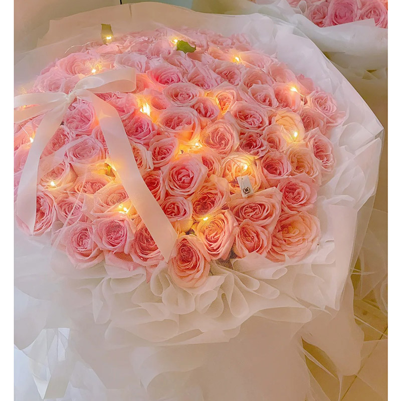 花 材:99朵粉玫瑰,1条灯带,1条缎带系蝴蝶结装饰。