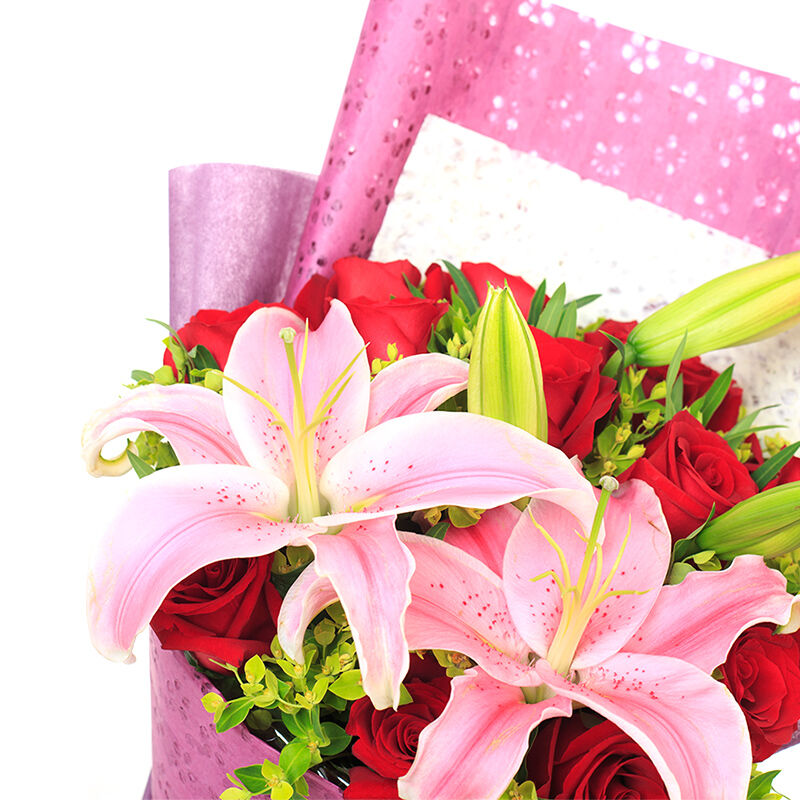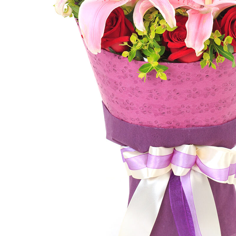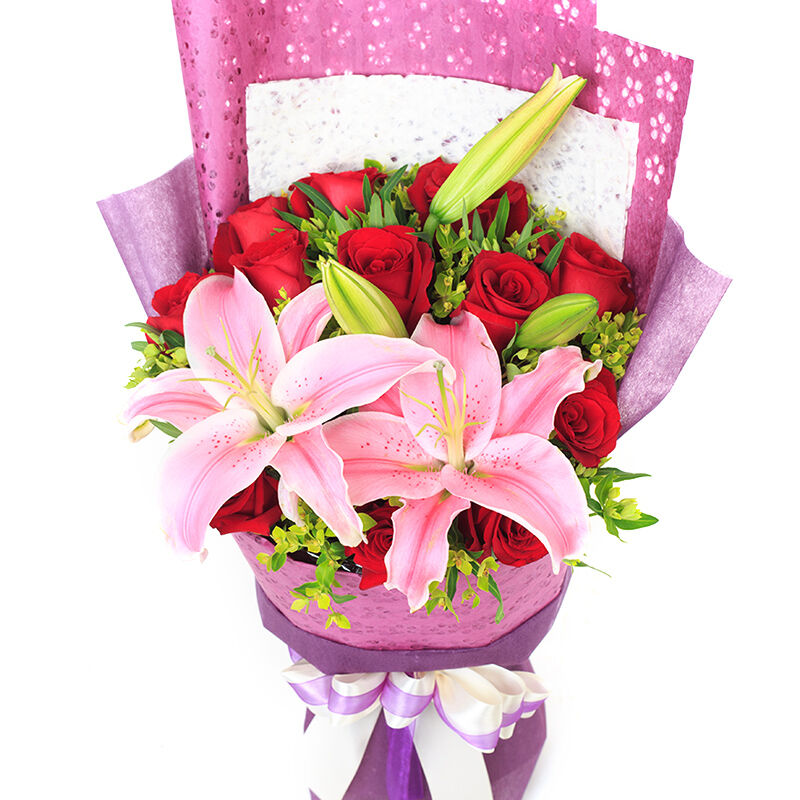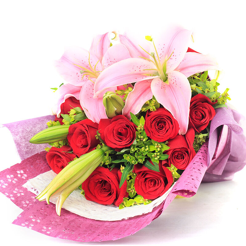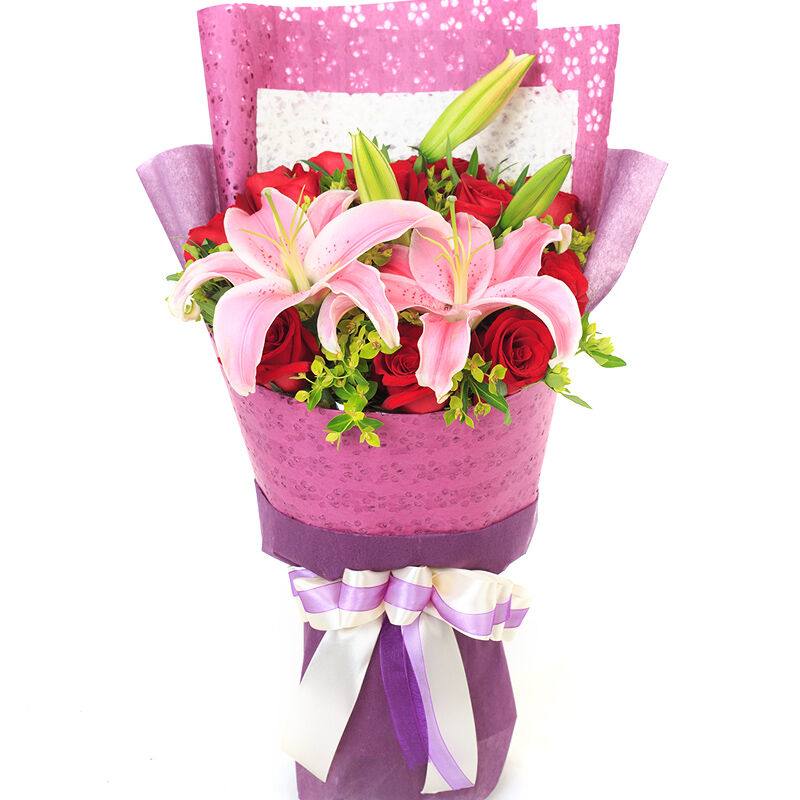 花材: 11支红玫瑰+2支多头粉百合,搭配绿叶或黄莺。