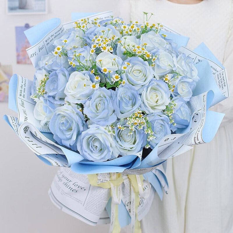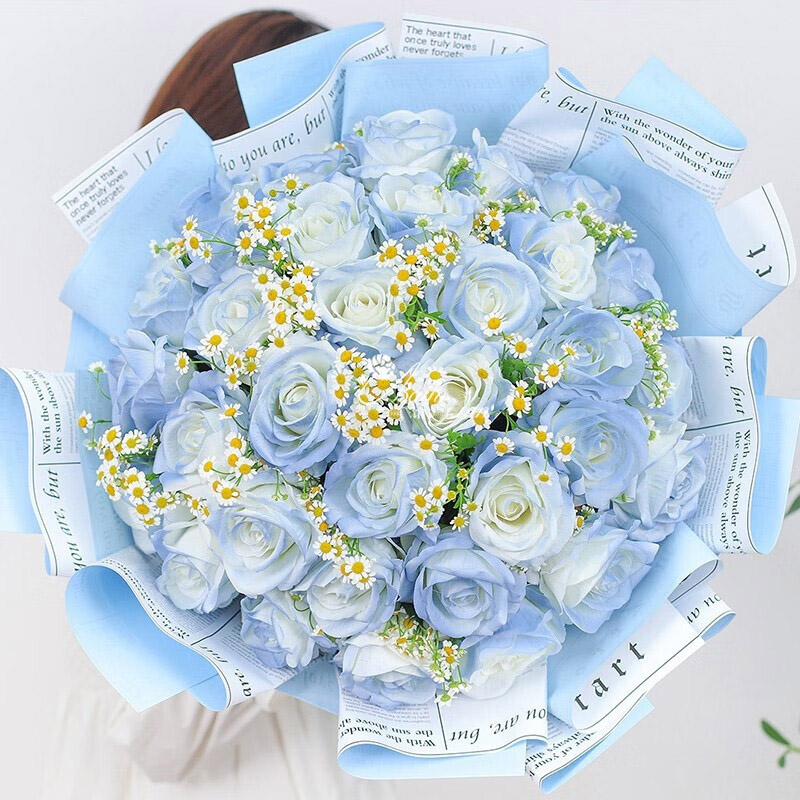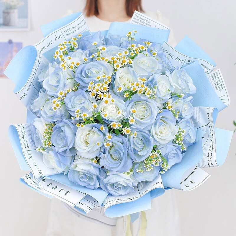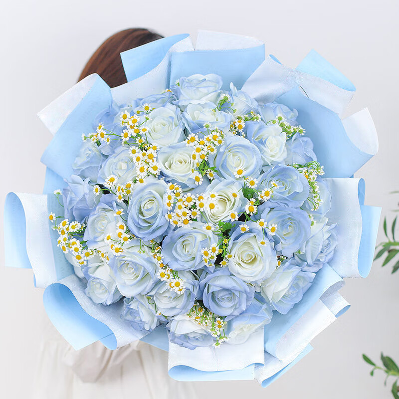 花材: 精选33枝碎冰蓝玫瑰,洋甘菊装饰(珍贵稀少花材,请提前预订或咨询花艺师)