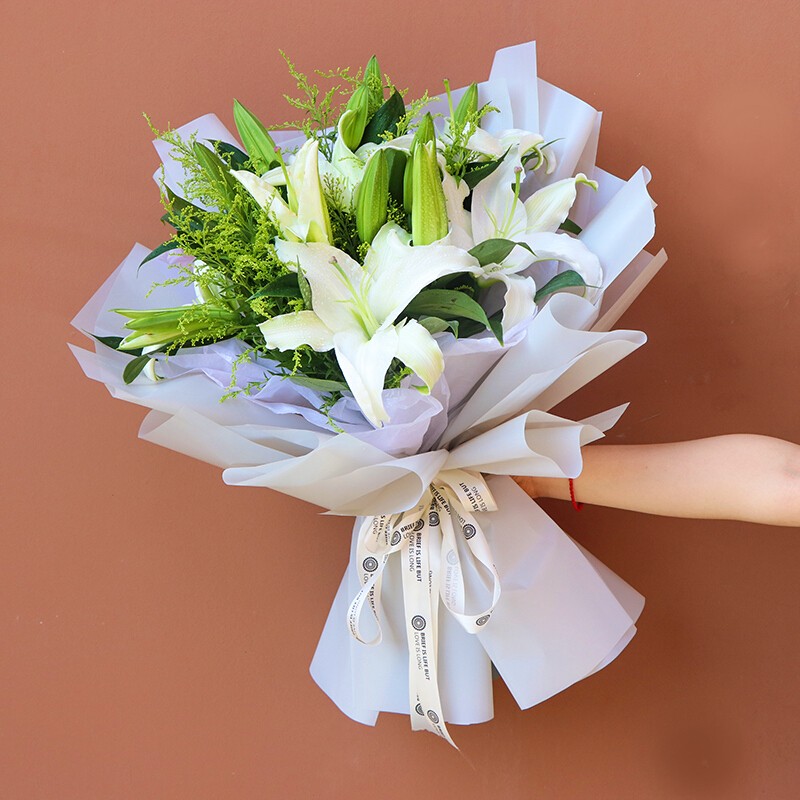 包装: 白色手揉纸内衬,白色透明雾面纸外包,香槟色英文花结。