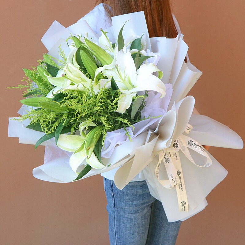 花材: 精选11朵白色香水百合,搭配黄莺草、绿叶装饰。