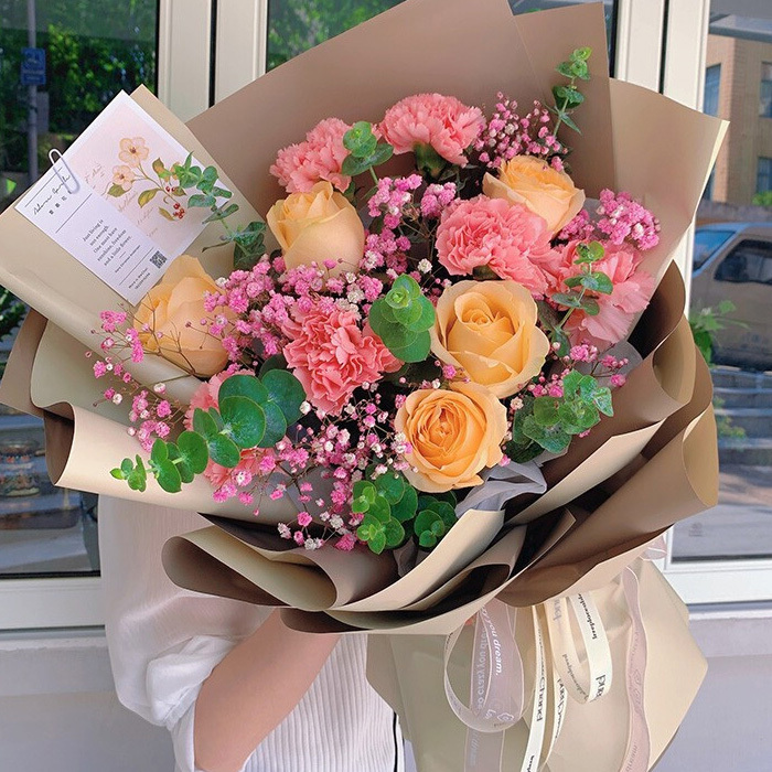 花 材:6朵粉康,5朵香槟玫瑰,粉色满天星,尤加利叶装饰。
