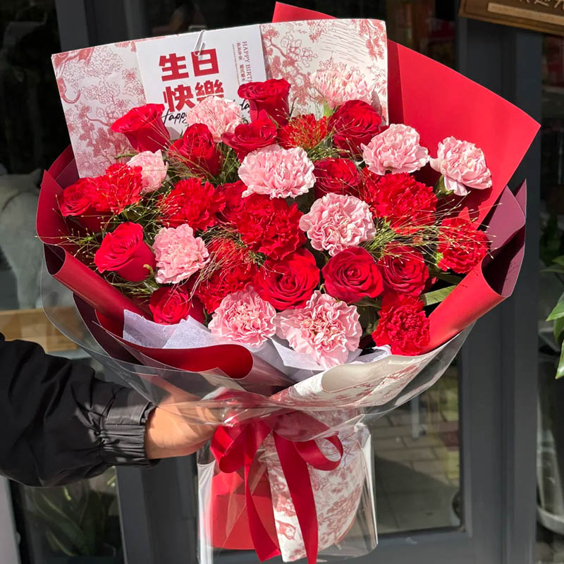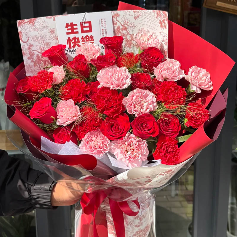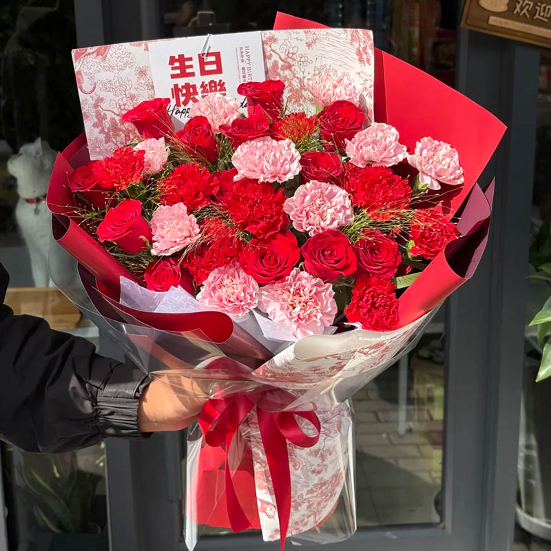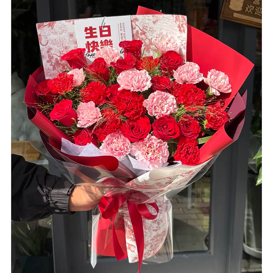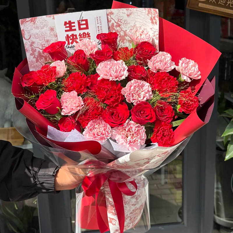 花材: 33枝红玫瑰和康乃馨混搭(红玫瑰10枝,粉色康乃馨11枝,红色康乃馨12枝),搭配喷泉草(或者尤加利叶)装饰。