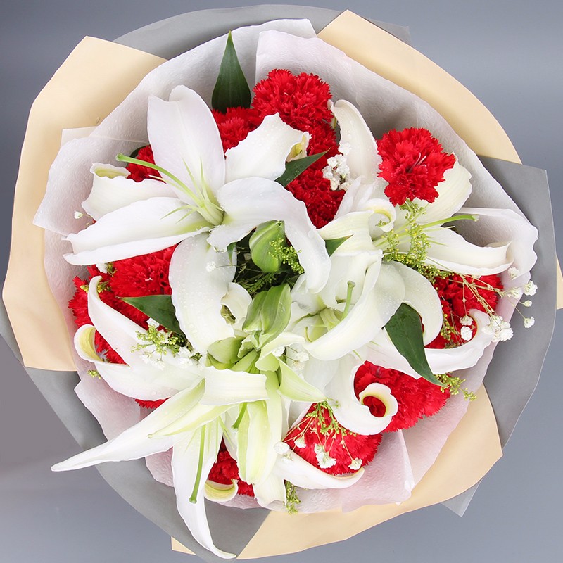 花材: 16支红色康乃馨,2支多头白百合,搭配适量满天星。