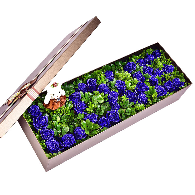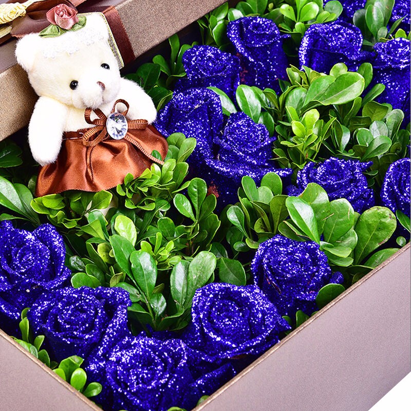 花材: 33支精品蓝色妖姬,“LOVE”形状,搭配丰满绿叶,1只可爱小熊。