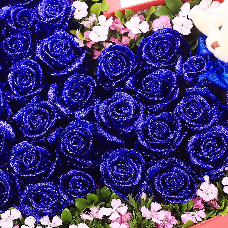 花 材:33支精品蓝色妖姬+2只可爱小熊,搭配适量相思梅。