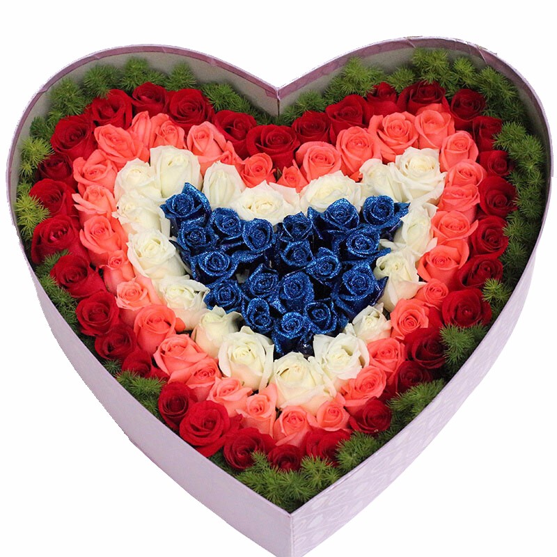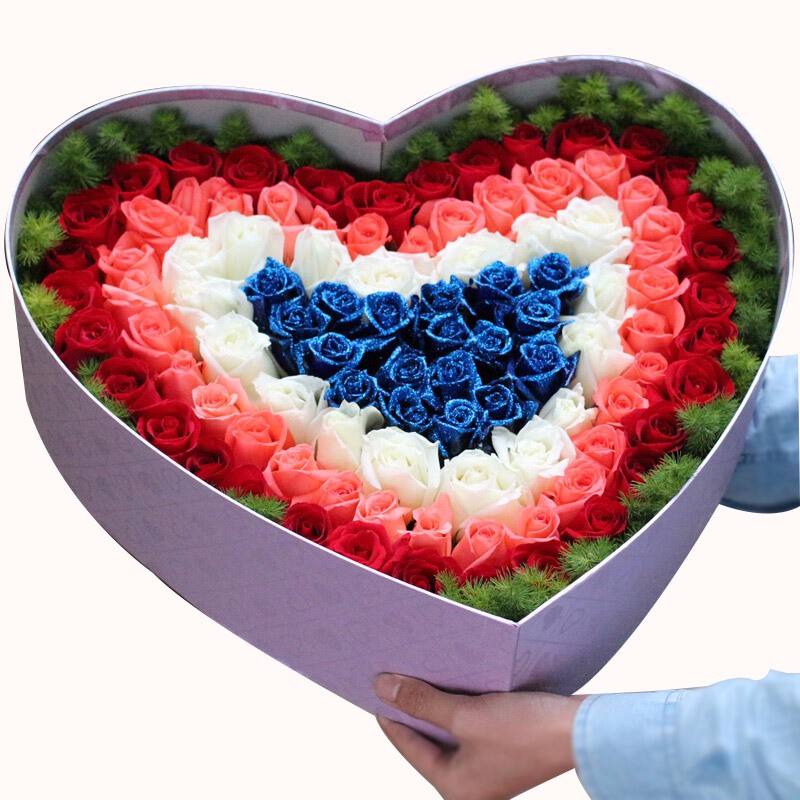 花材: 99支混色玫瑰(蓝色妖姬、白玫瑰、粉玫瑰、红玫瑰),搭配适量天冬门。
