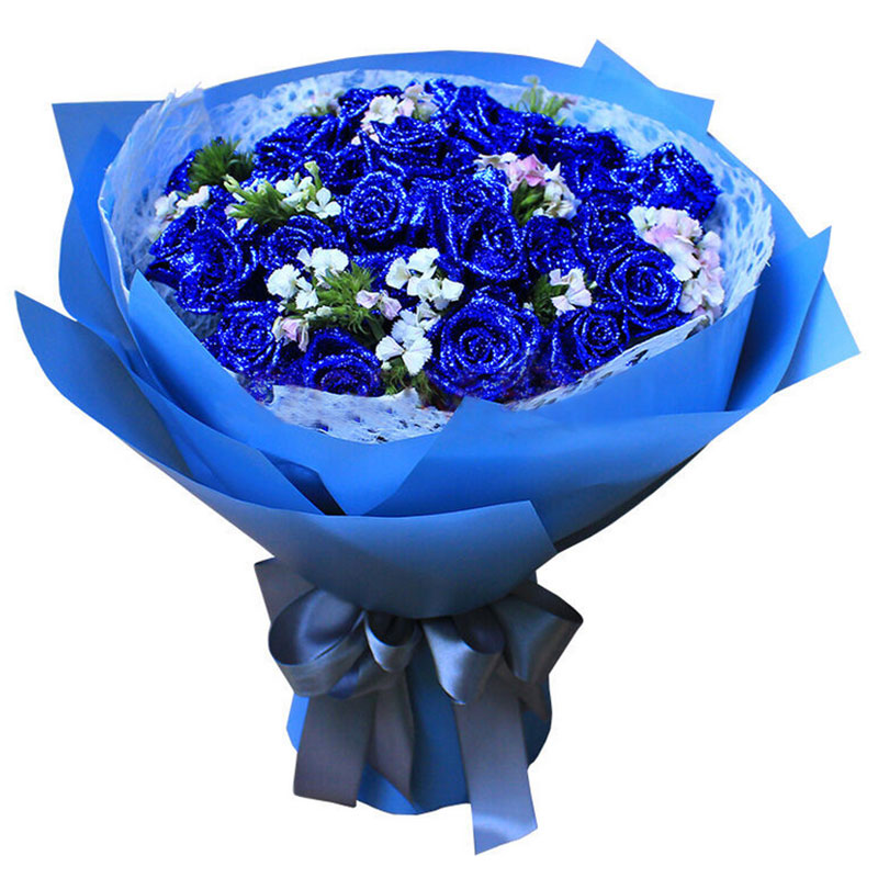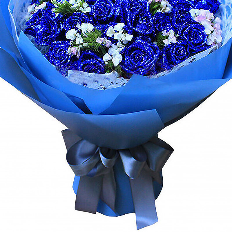 花材: 33支精品蓝色妖姬,搭配适量相思梅。