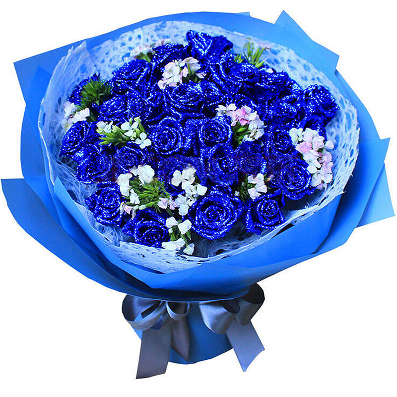花 材:33支精品蓝色妖姬,搭配适量相思梅。