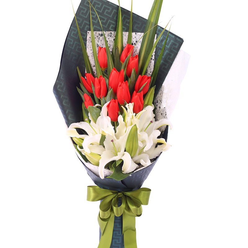 花材: 11支精品红色郁金香,搭配3支多头百合。