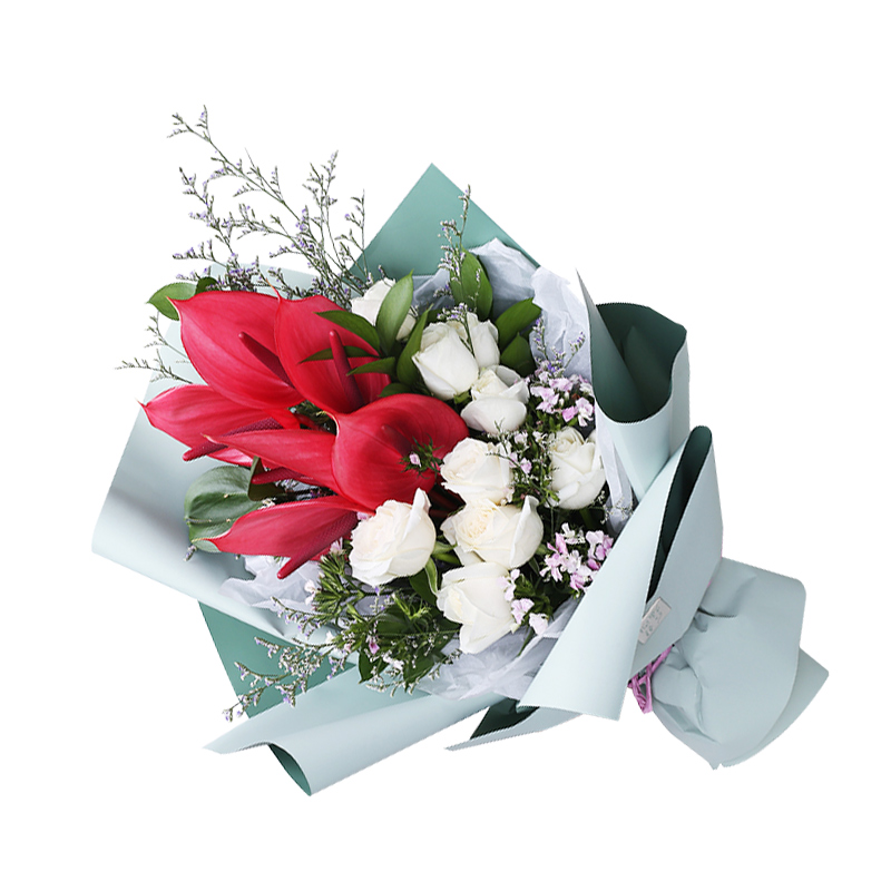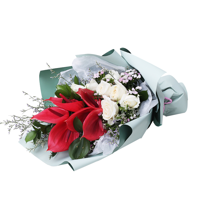 花材: 9朵白玫瑰,5枝红掌,搭配相思梅、水晶草、栀子叶。
