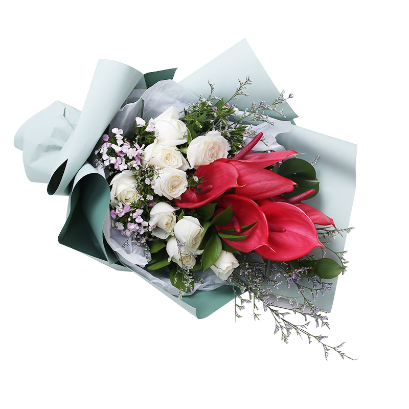花 材:9朵白玫瑰,5枝红掌,搭配相思梅、水晶草、栀子叶。