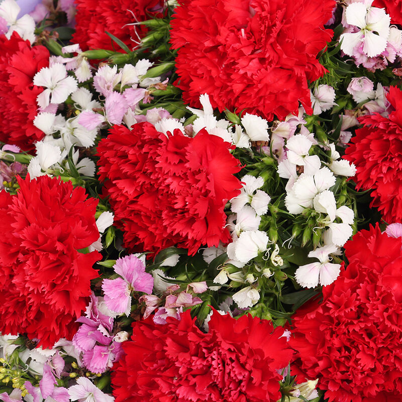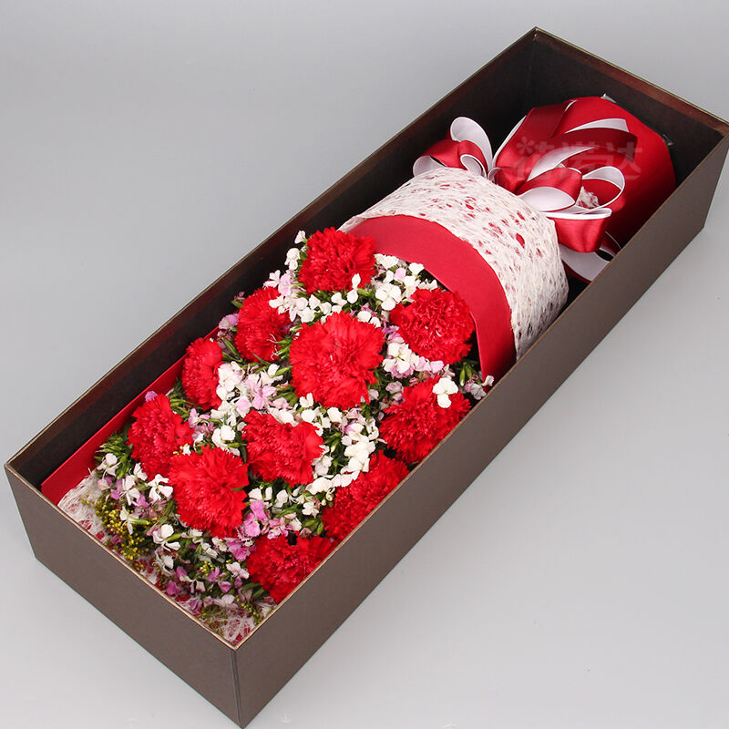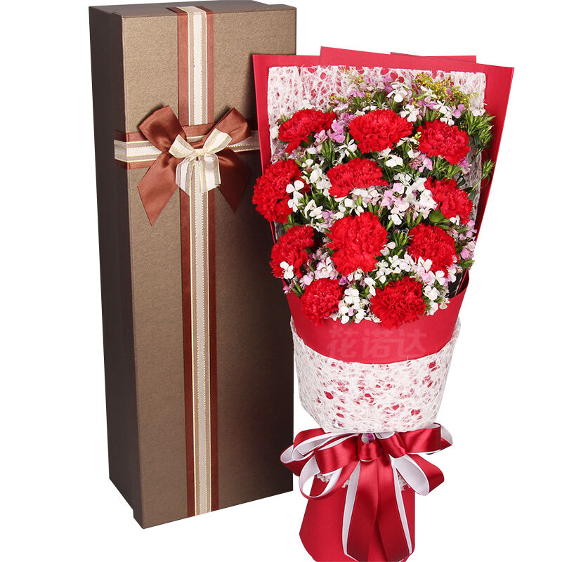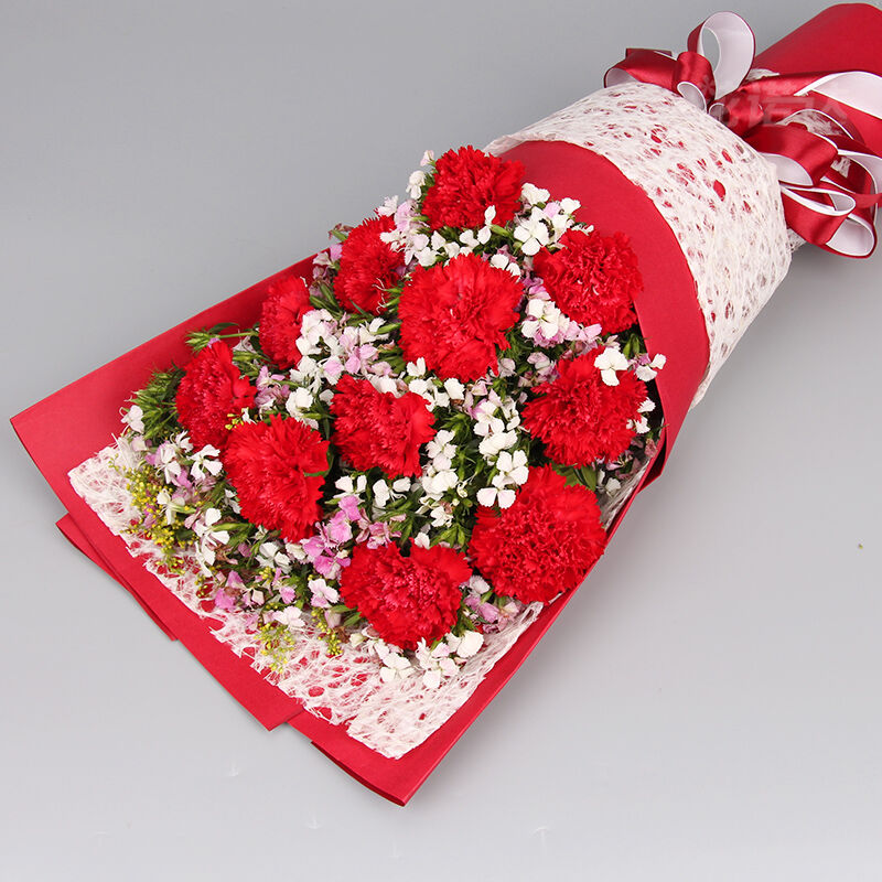 花 材:11支精品红康乃馨,搭配适量相思梅。