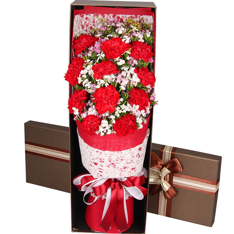 花材: 11支精品红康乃馨,搭配适量相思梅。