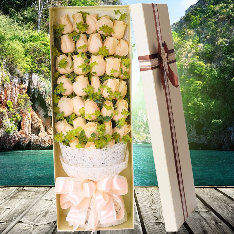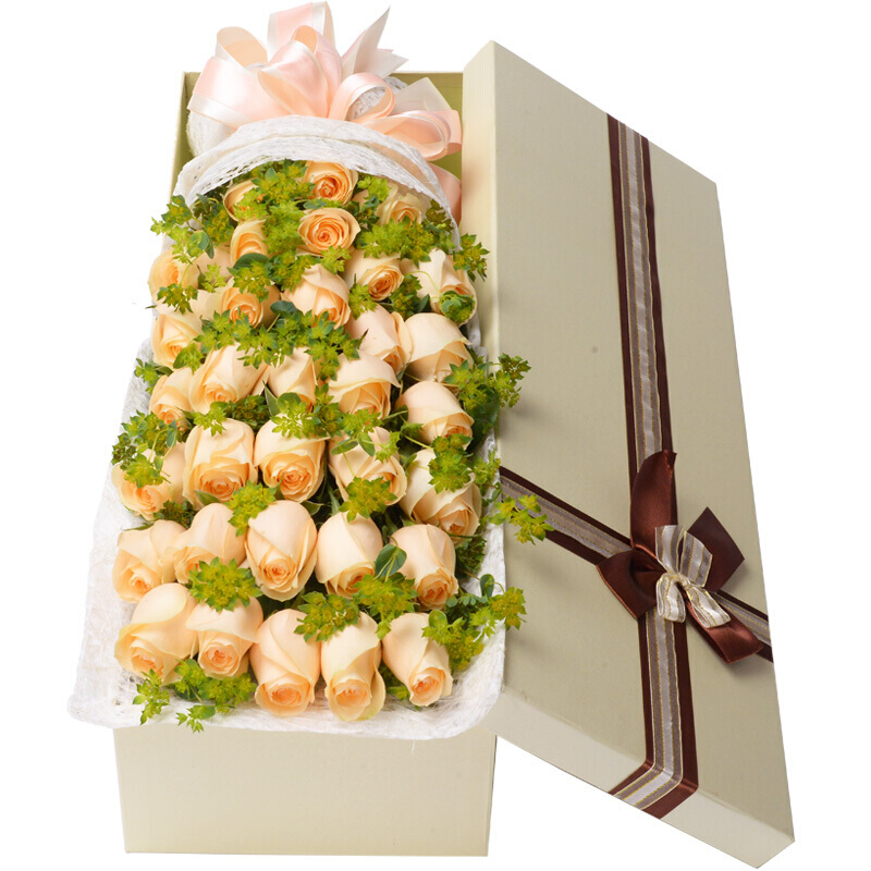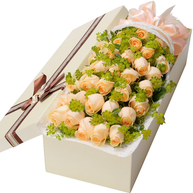 花材: 33朵香槟玫瑰,搭配叶上黄金,丰满围绕。