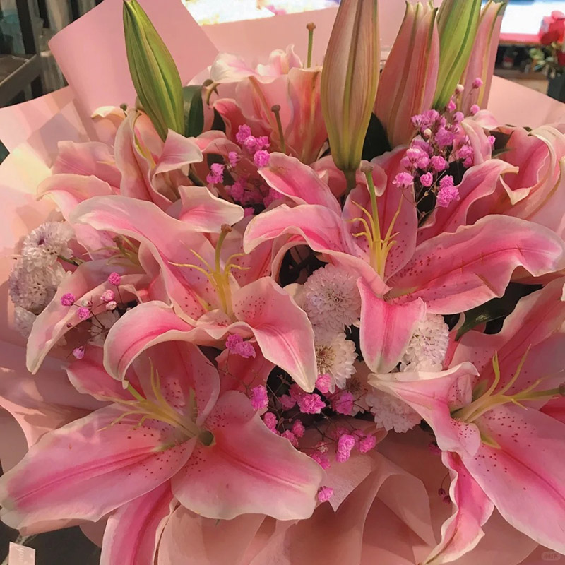 花材: 精选18朵粉色香水百合,粉色满天星,小雏菊装饰。(小雏菊断货可用白色满天星、洋甘菊、洋桔梗代替)