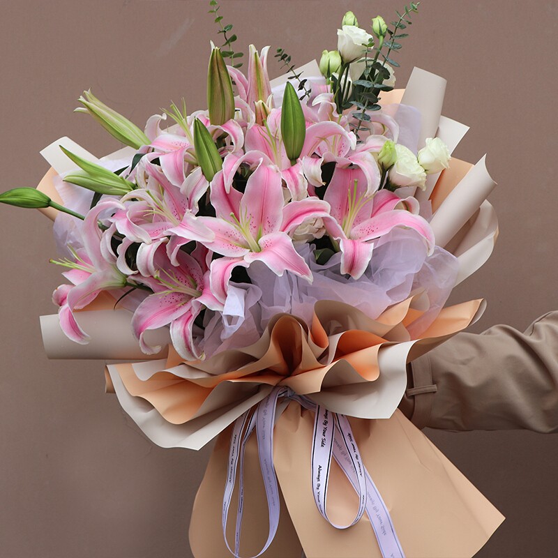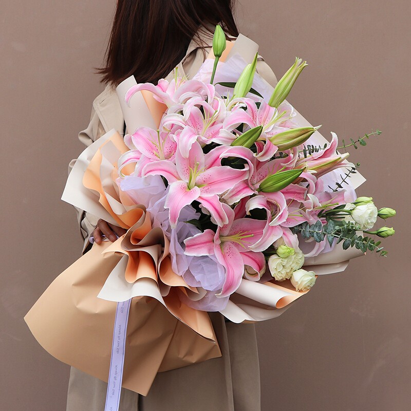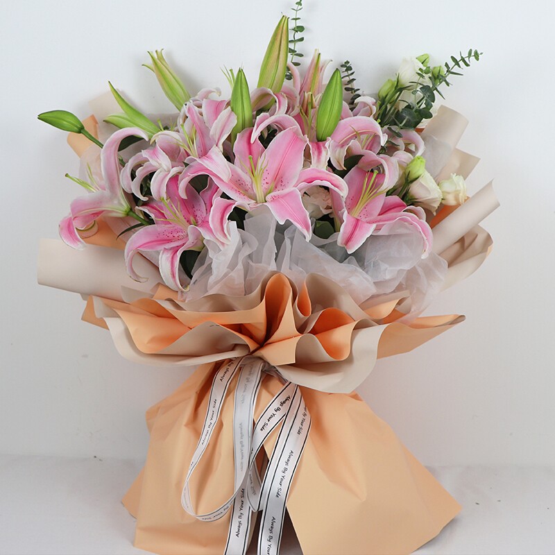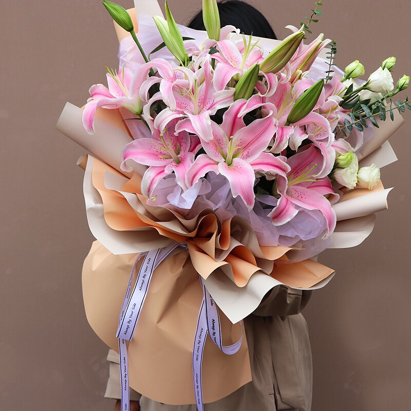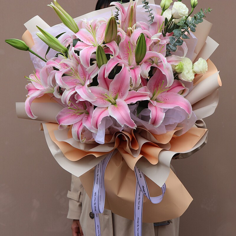 花 材:精选18朵粉色百合,搭配2支洋桔梗、尤加利叶装饰。
