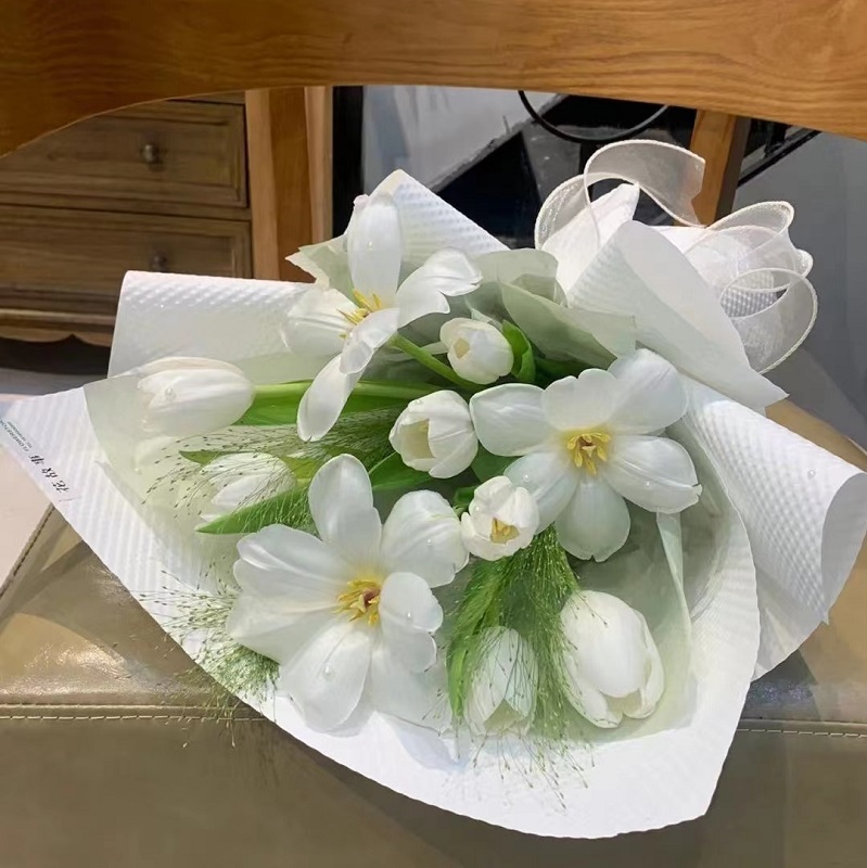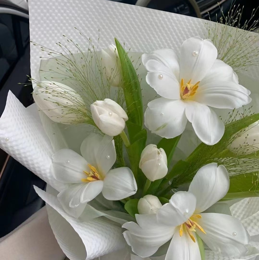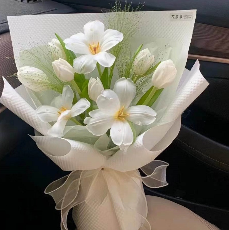 花 材:精选9朵白色郁金香,喷泉草装饰。(郁金香为季节性花材,花期为3-5月,需提前订购)