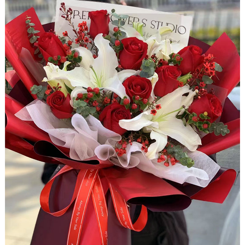 花材: 9朵红玫瑰,2支白色多头香水百合,搭配火龙珠、尤加利叶间插。