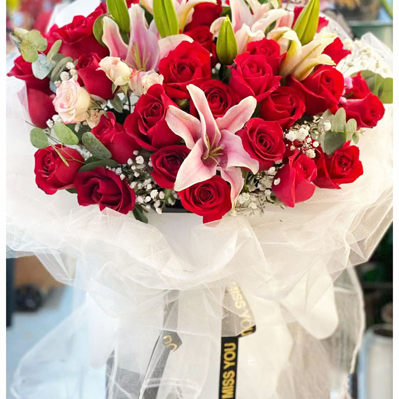 花材: 33朵红玫瑰,4支多头粉色香水百合,搭配尤加利叶、满天星装饰。