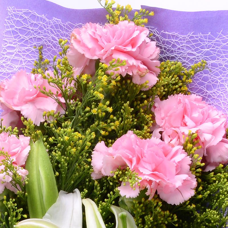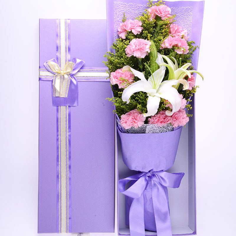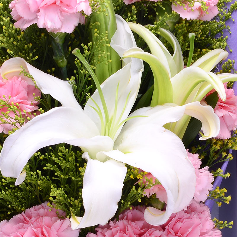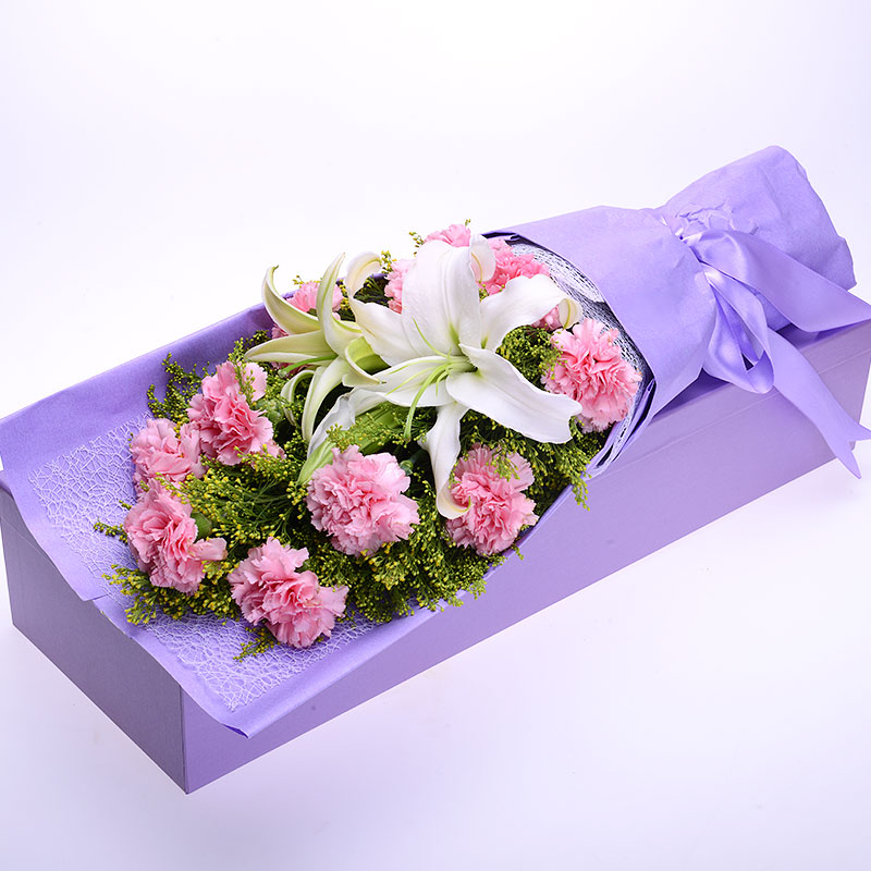 花 材:11支精品粉色康乃馨,搭配1支多头白百合、适量黄莺。