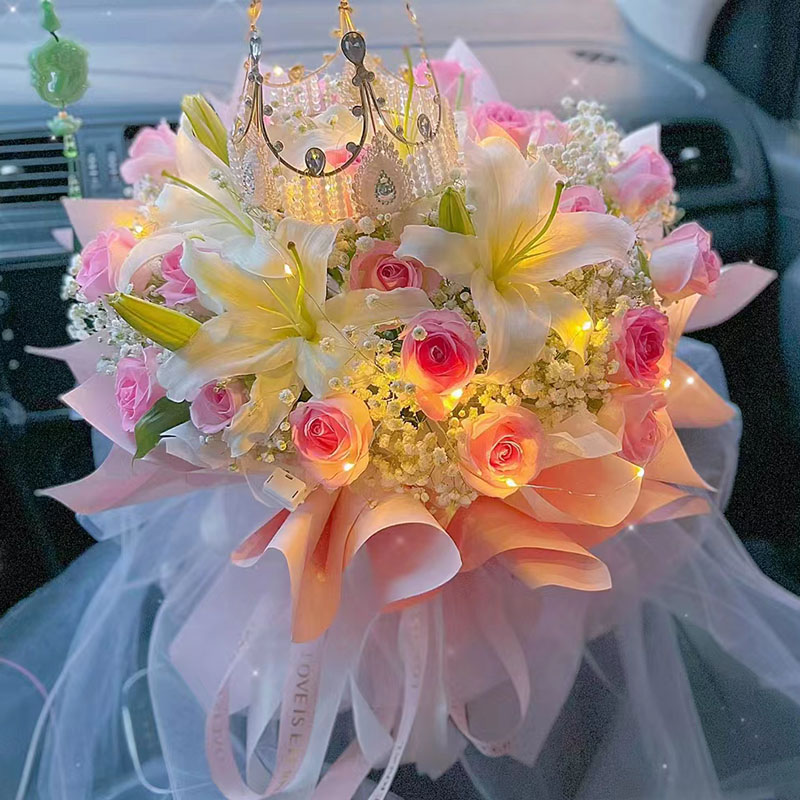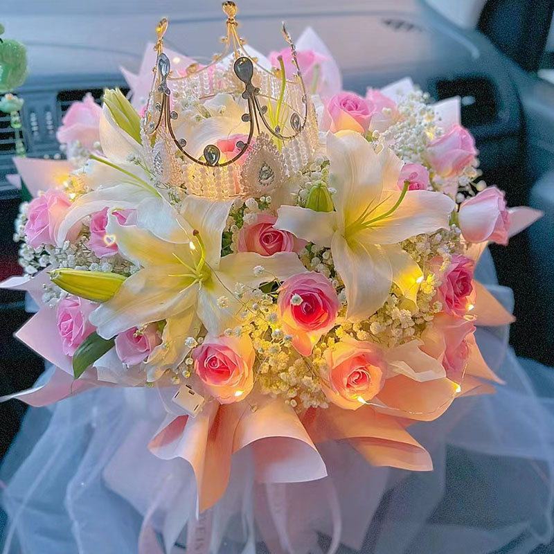 花 材:精选19朵粉玫瑰,4支多头白色香水百合,1条灯带,1个皇冠(款式随机),搭配满天星、尤加利叶间插。