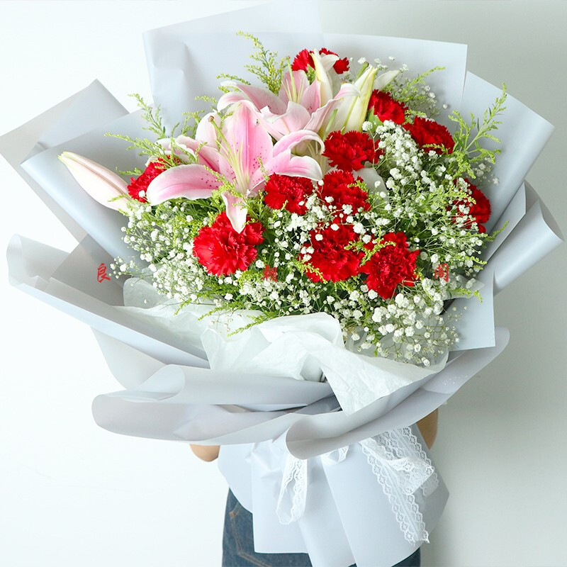 花材: 11朵红色康乃馨,2支粉色多头百合,搭配大量满天星、黄莺草装饰。