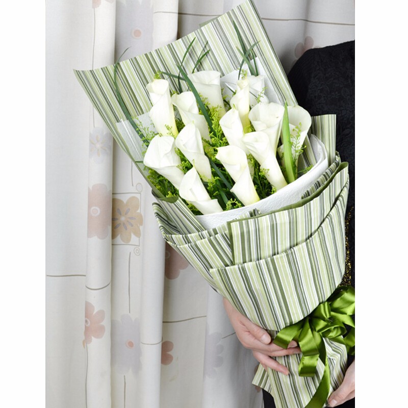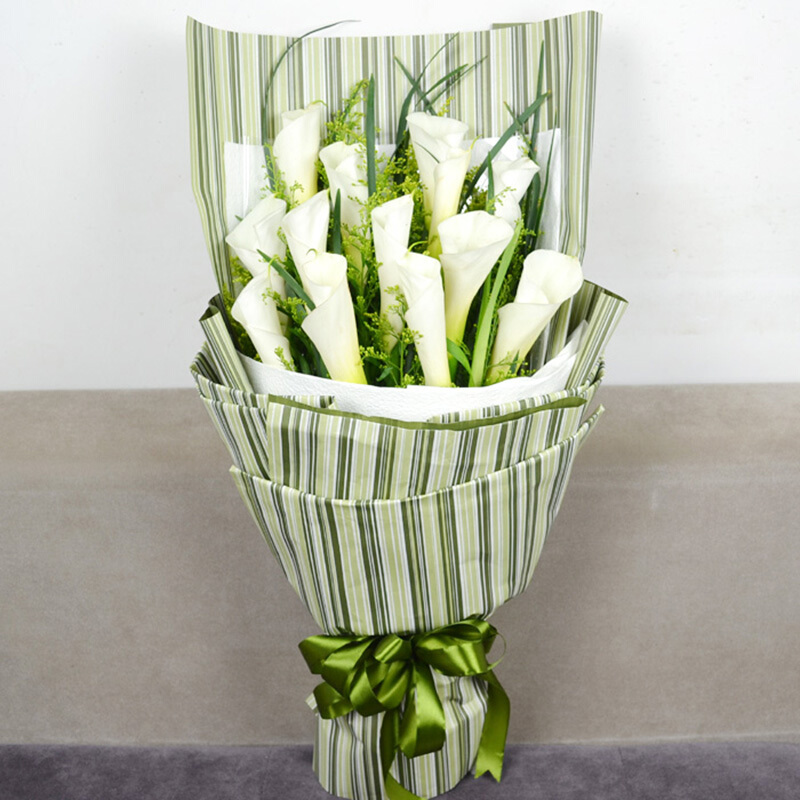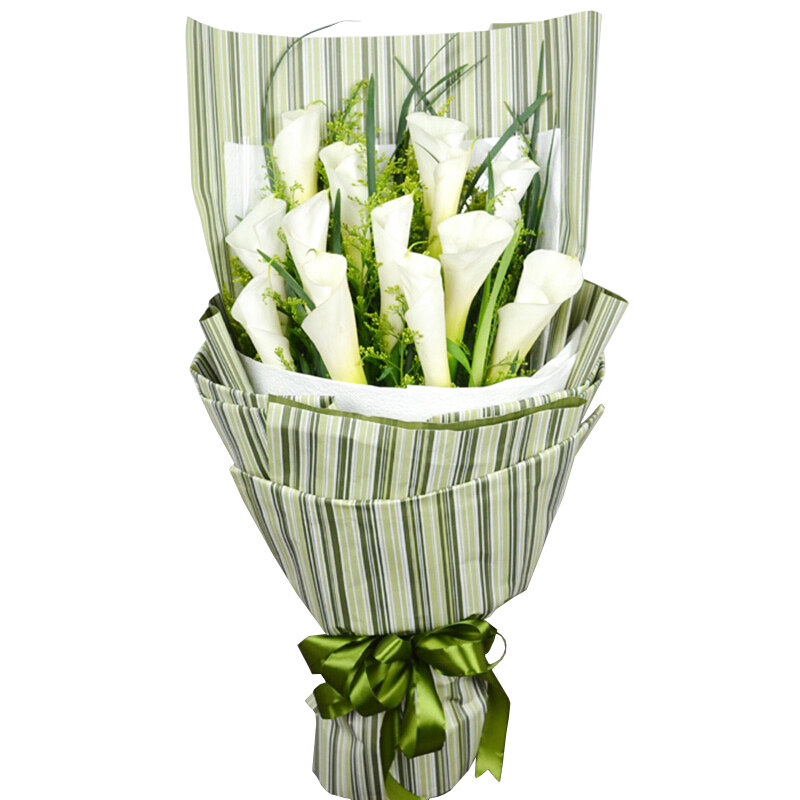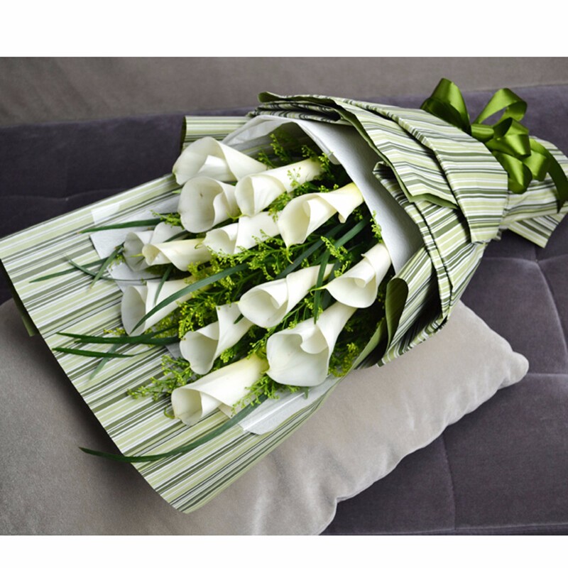 花材: 16朵白色马蹄莲,搭配黄莺、绿叶(珍贵 稀少花材,请提前1-3天预订或咨询客服)。