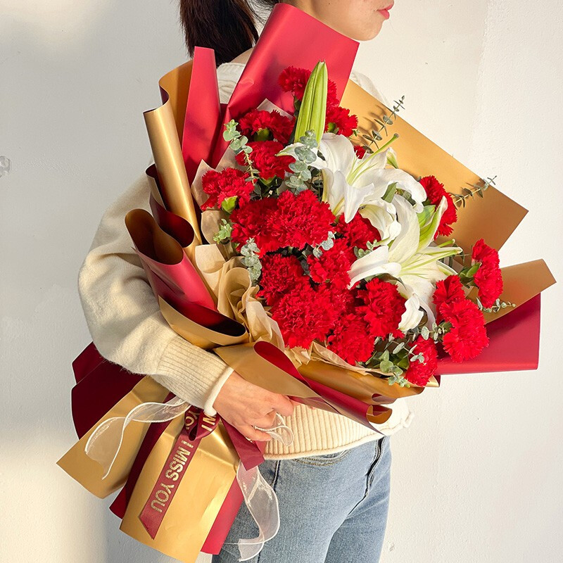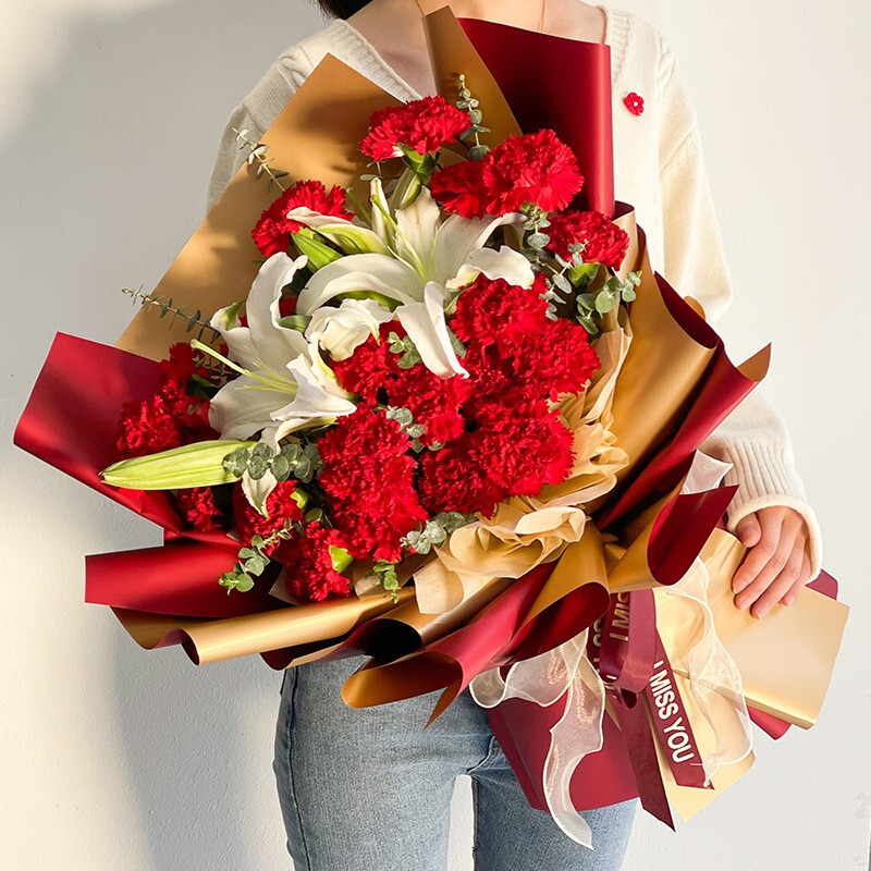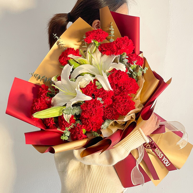 花材: 19朵红色康乃馨,2支白色多头香水百合,搭配尤加利叶装饰。