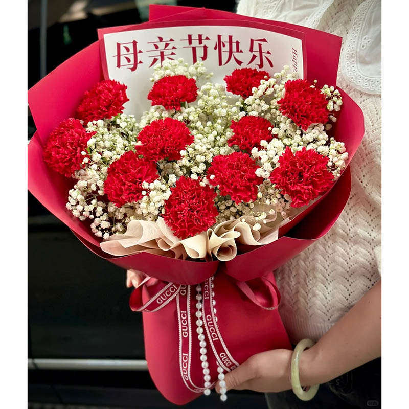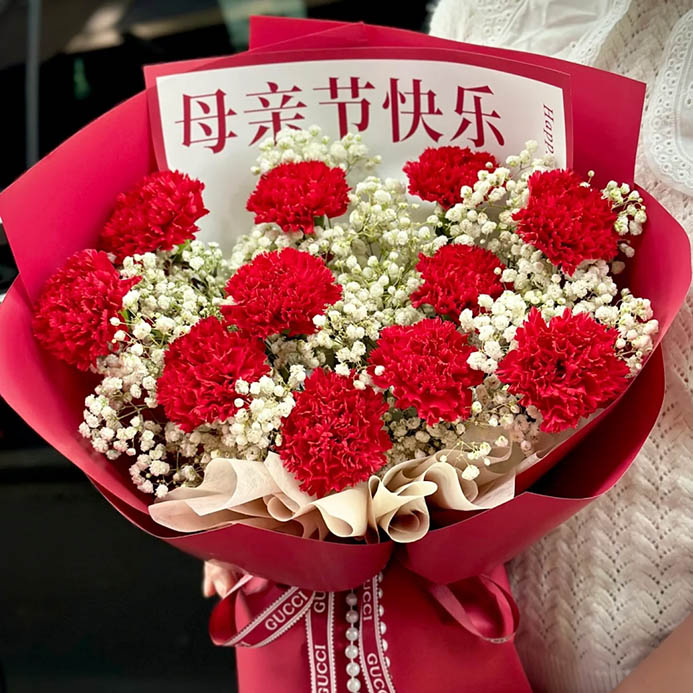 花材: 11枝红色康乃馨,搭配白色满天星丰满间插。