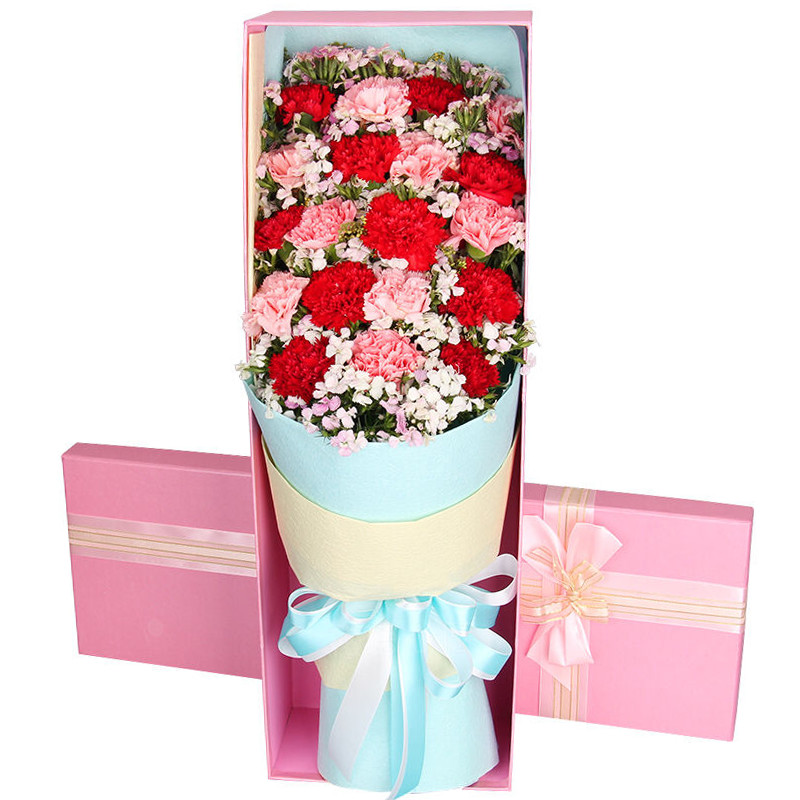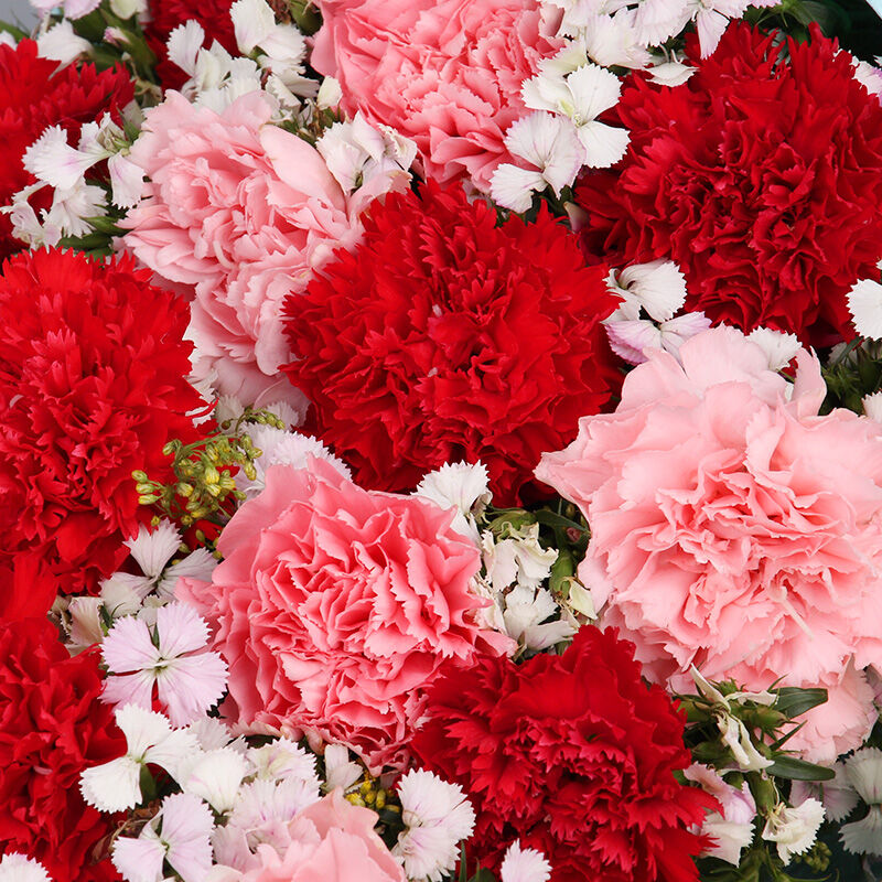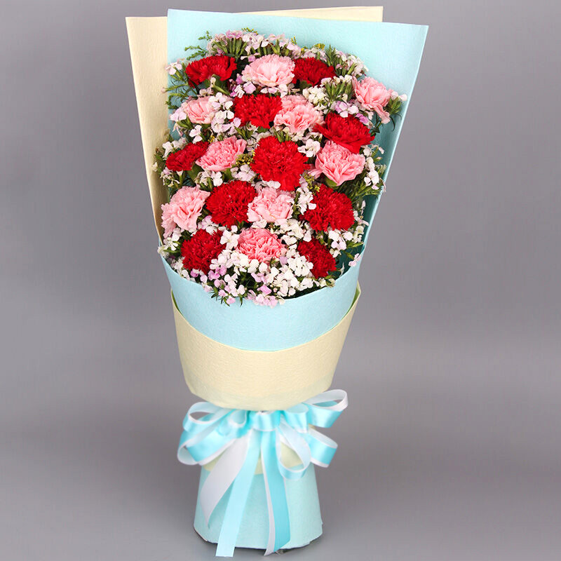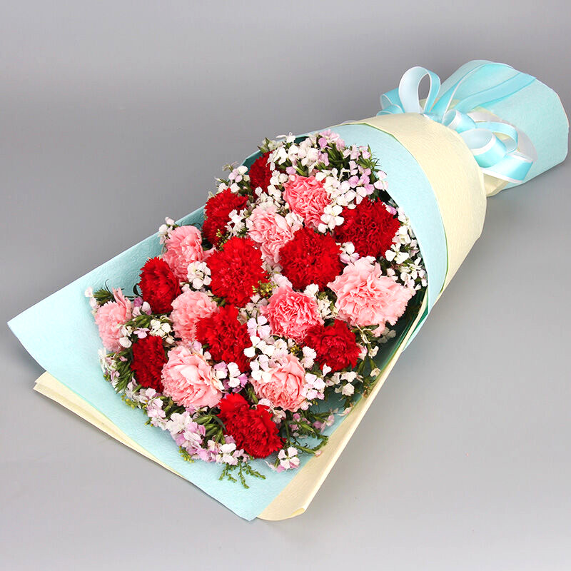 花材: 19支混色康乃馨(红康乃馨+粉红康乃馨),搭配石竹梅、黄莺。