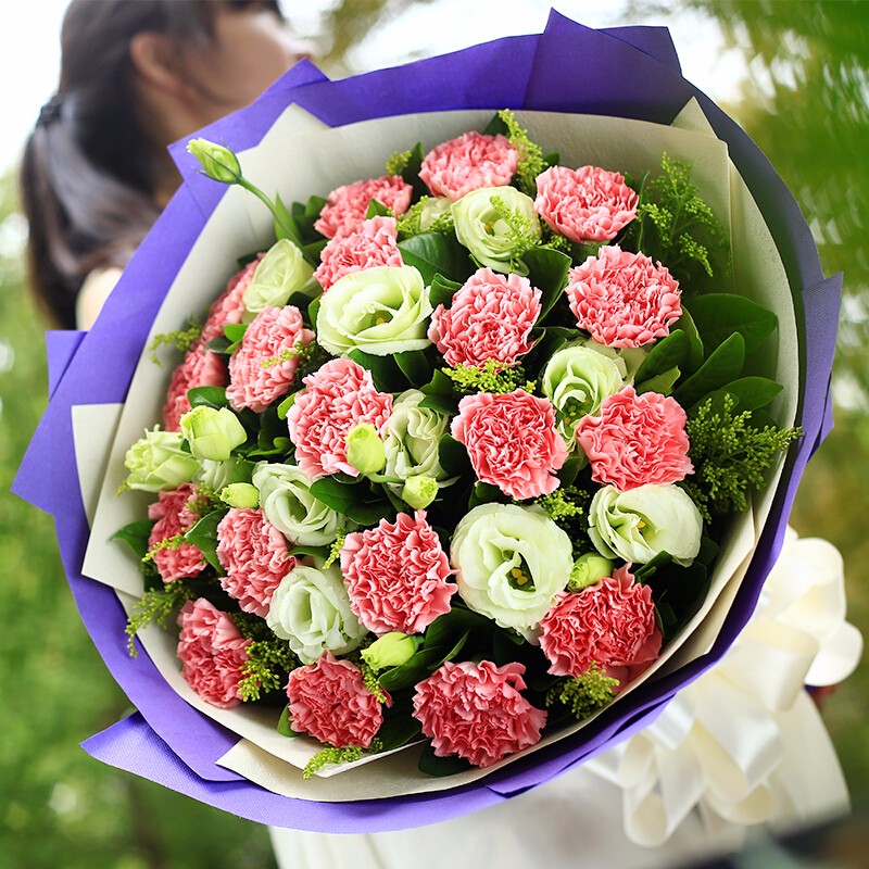 花材: 19支粉色康乃馨,搭配适量7支桔梗、绿叶。