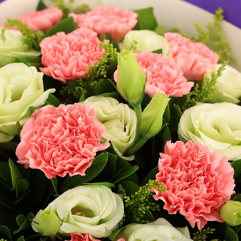 花 材:19支粉色康乃馨,搭配适量7支桔梗、绿叶。