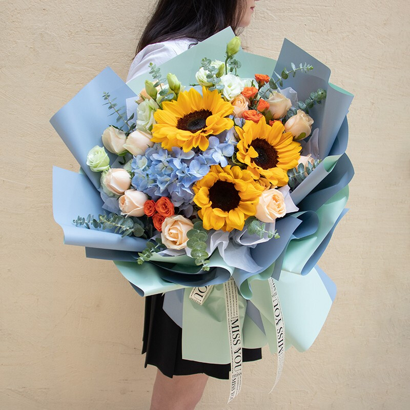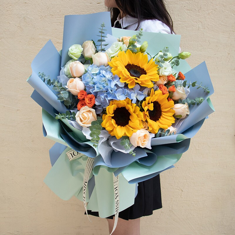 花 材:精选3支向日葵,1支蓝色绣球,11朵香槟玫瑰,搭配2支多头橙色小玫瑰,尤加利叶,桔梗装饰。