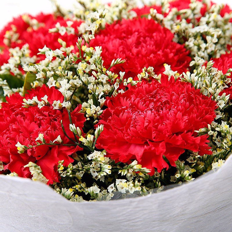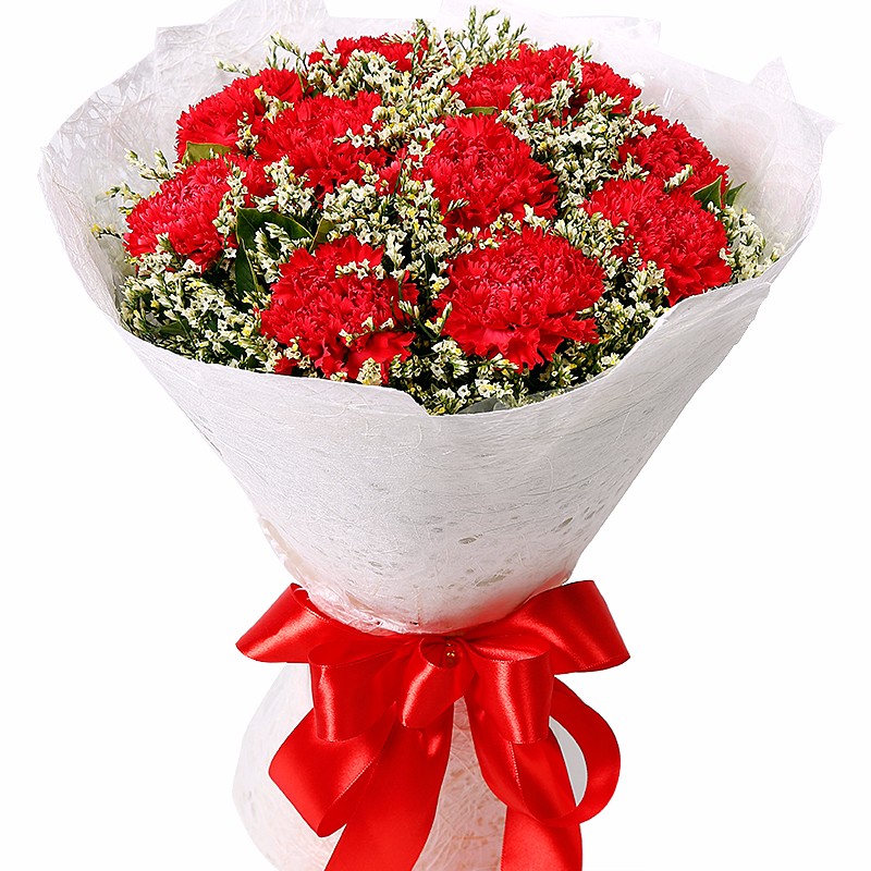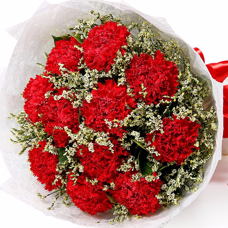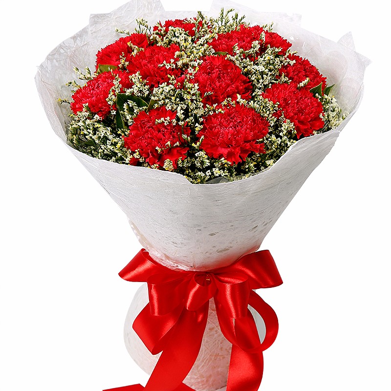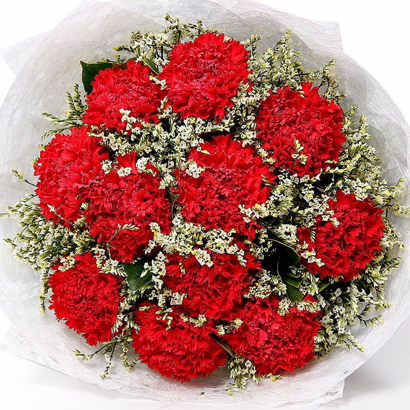 花 材:11支红色康乃馨,搭配适量水晶草。