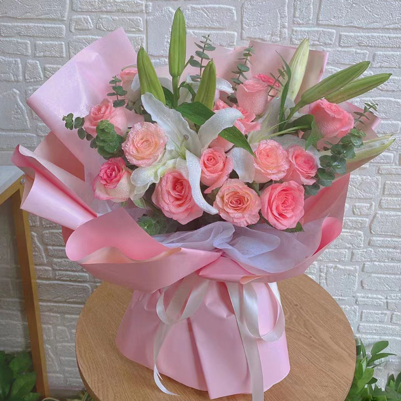 花材: 11朵粉玫瑰,2支多头白色香水百合,搭配4支粉色洋桔梗(断货则用4支粉康代替),尤加利叶装饰。