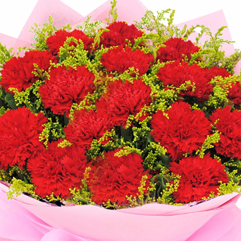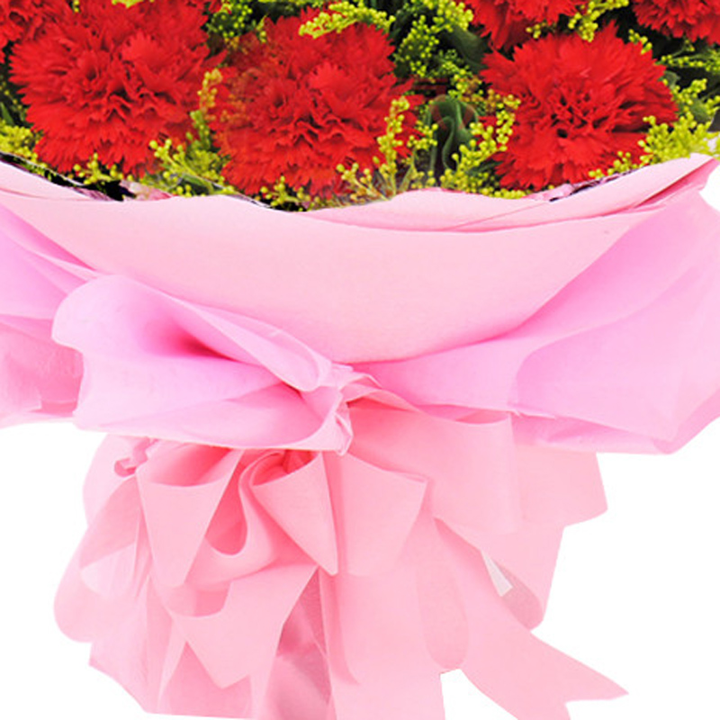 花 材:19支红色康乃馨,搭配适量黄莺。