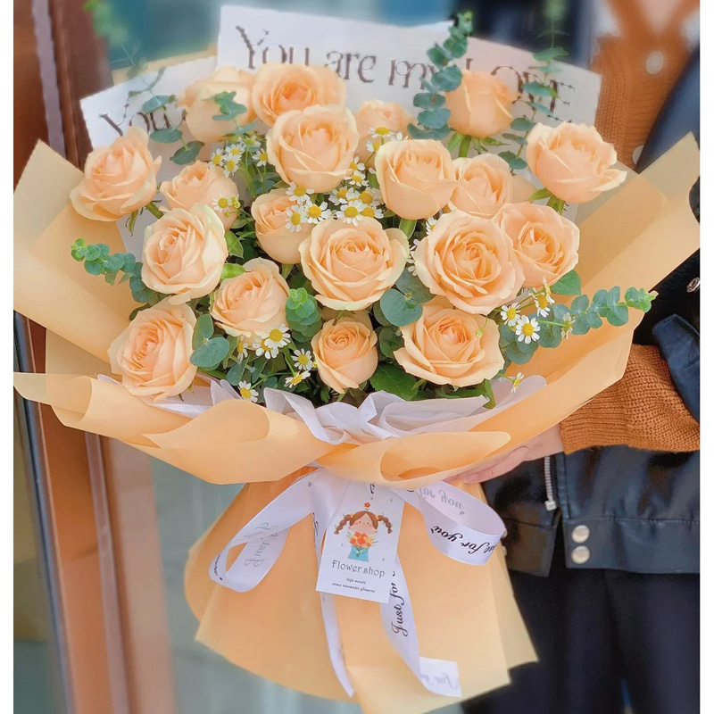 花材: 19朵香槟玫瑰,搭配尤加利叶、洋甘菊(断货则用白色满天星等类似配花代替)装饰。