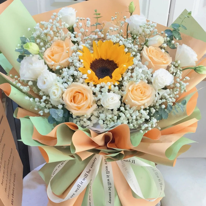 花 材:精选1支向日葵,4支香槟玫瑰,6支洋桔梗,满天星、尤加利叶间插装饰。