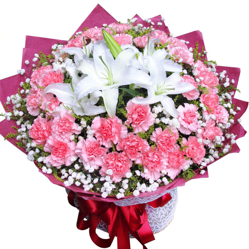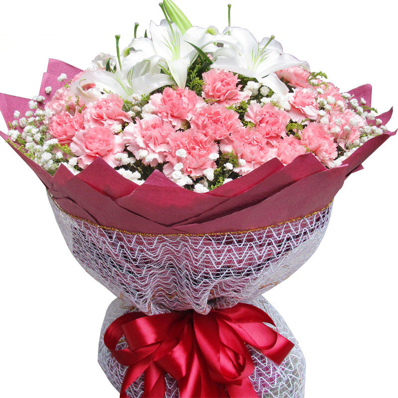 花材: 33支粉色康乃馨,2支多头白百合,搭配黄莺、满天星。