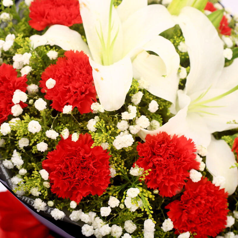 花材: 11支红色康乃馨+1支多头白百合,搭配黄莺、满天星。