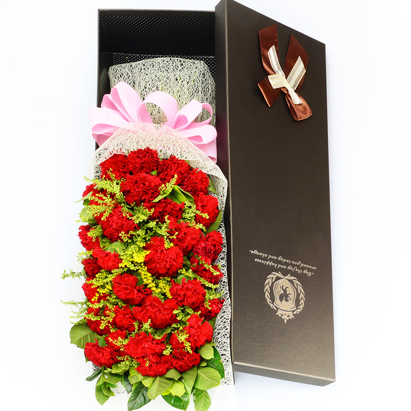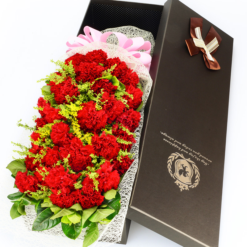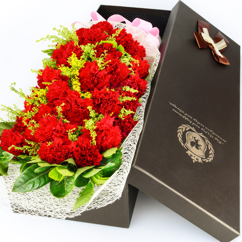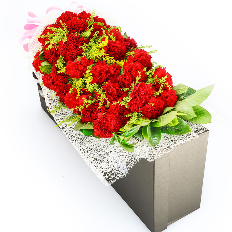 花材: 19支红色康乃馨,搭配适量黄莺、绿叶。