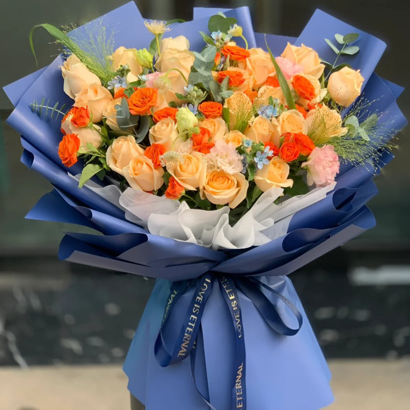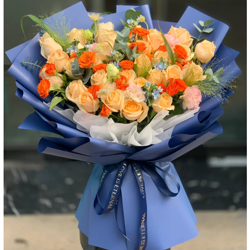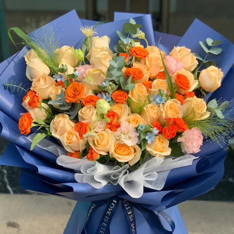 花材: 33朵香槟玫瑰,橙色多头小玫瑰10支,搭配洋桔梗,尤加利叶,喷泉草,蓝色满天星装饰。