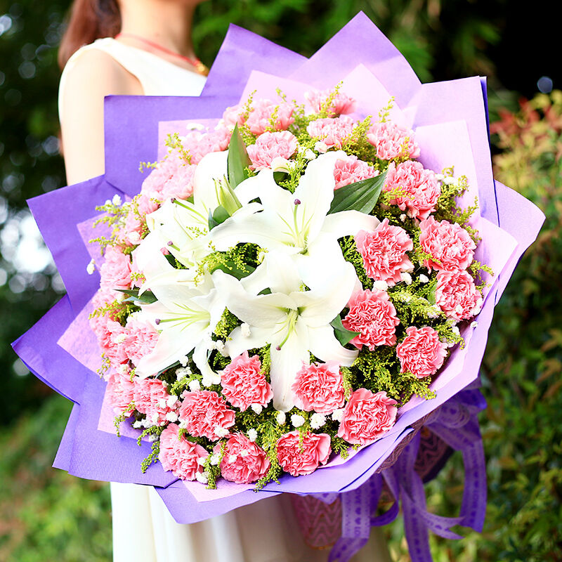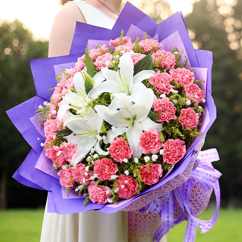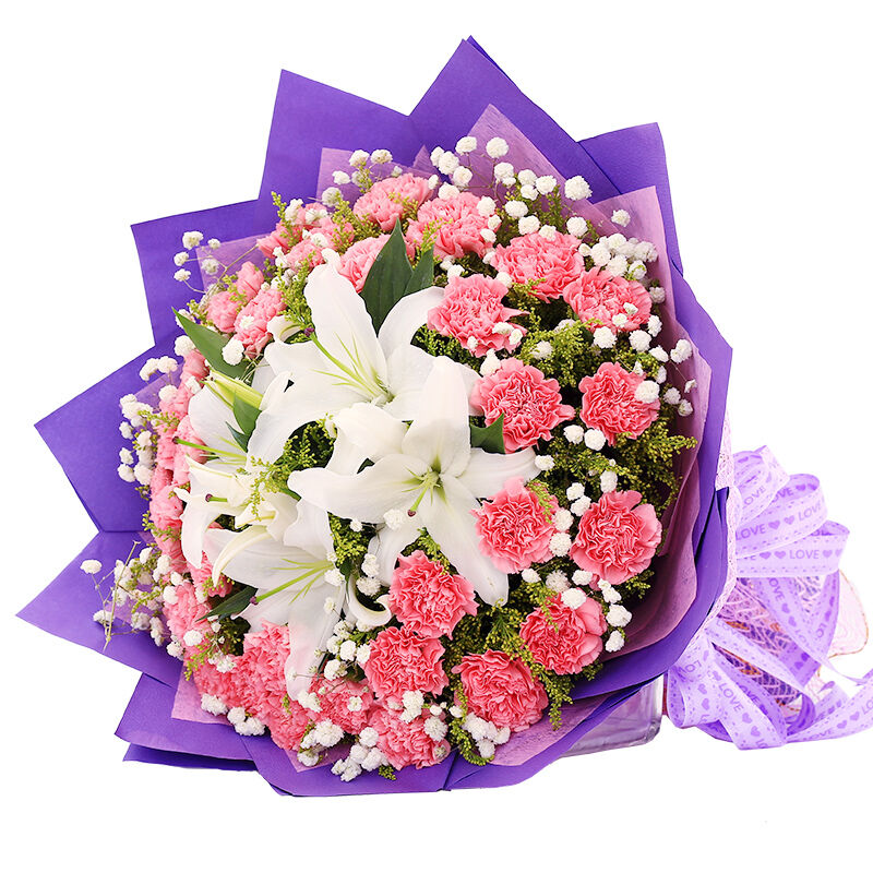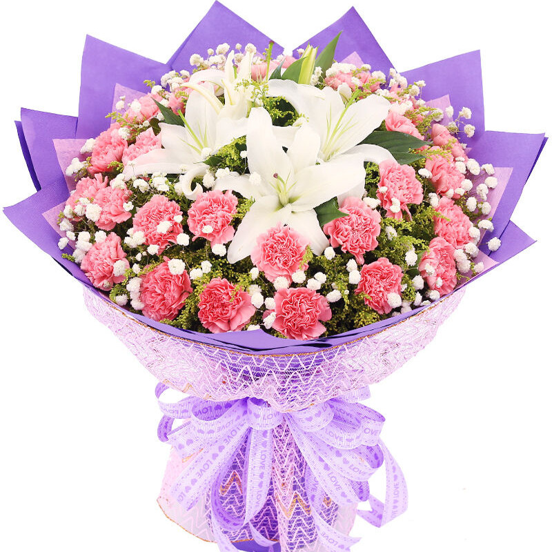花材: 33支粉色康乃馨+2支多头白百合,搭配黄莺、满天星。